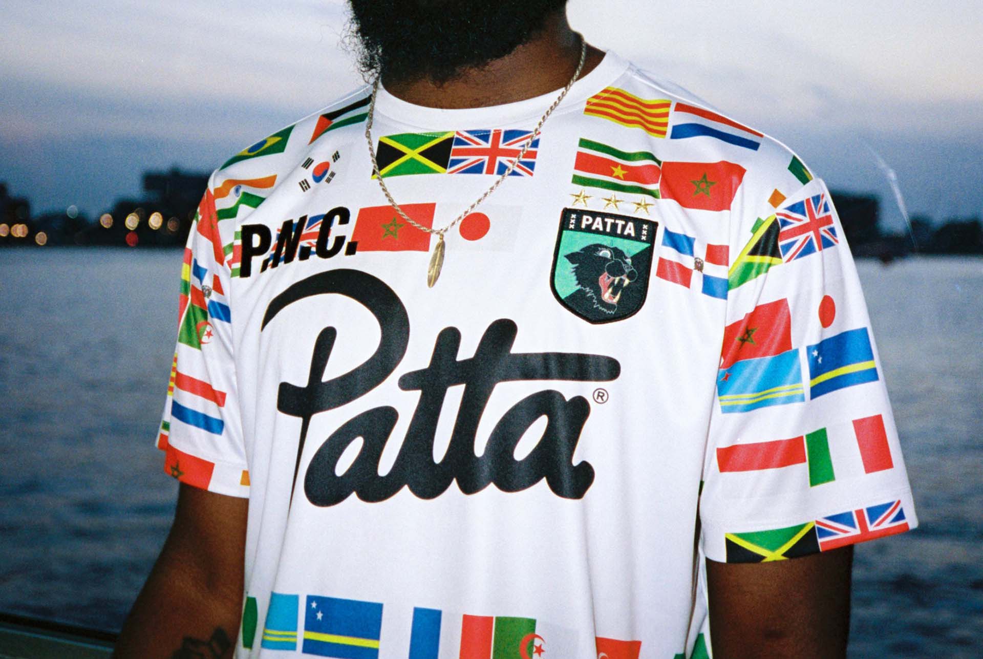 The new jersey reverses the color scheme from the previous year, if the base was white before, now the flags stand out against a black background. The logo of the brand founded by Edson Sabajo and Guillaume ‘Gee’ Schmidt in 2004 is placed oversize in the middle of the chest, just below the crest with the panther. A new project that unites Patta to the local music scene and above all to the world of football, after the many personal projects and collaborations, among all the one with Umbro.