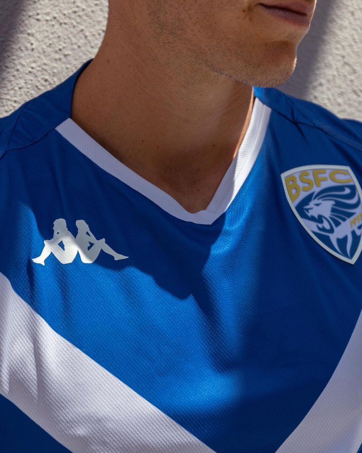 Kappa has created two kits that reflect the club's tradition and one of the most recognizable shirts in Italian football and beyond. Therefore, on the chest of the two kits, the inverted chevron that has appeared on the swallows' shirts since 1927 is not missing. During the course of the club's history, this graphic element has been abandoned and recovered several times, first in 1961 and then in 1991, the year in which it was been entered and never left again. The colors of the home shirt are white and blue, with a V-neck and white shorts. On the other hand, the away shirt is in reversed colors, in which the gold details that characterize the edges of the sleeves, the socks and the neck of the shirt are more evident. The lion is another element that embellishes the shirt, obviously present in the crest and on the shin of the socks, a celebratory detail of the club's history as well as the wording "Adòs", the meaning of which is explained by some historic fans in the video published by Brescia and Kappa to present the new jerseys.