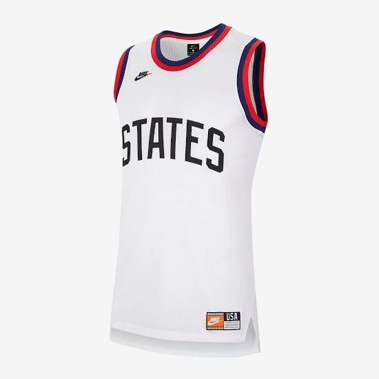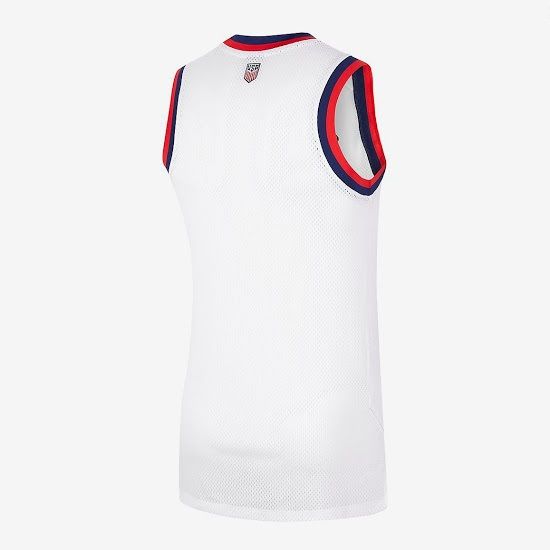 The basketball jersey, on the other hand, is obviously sleeveless and reproduces the style of an NBA tank top, with white as the main color, blue and red details and STATES. Unlike the baseball one, a further detail is added, namely the crest of the US Soccer Team.