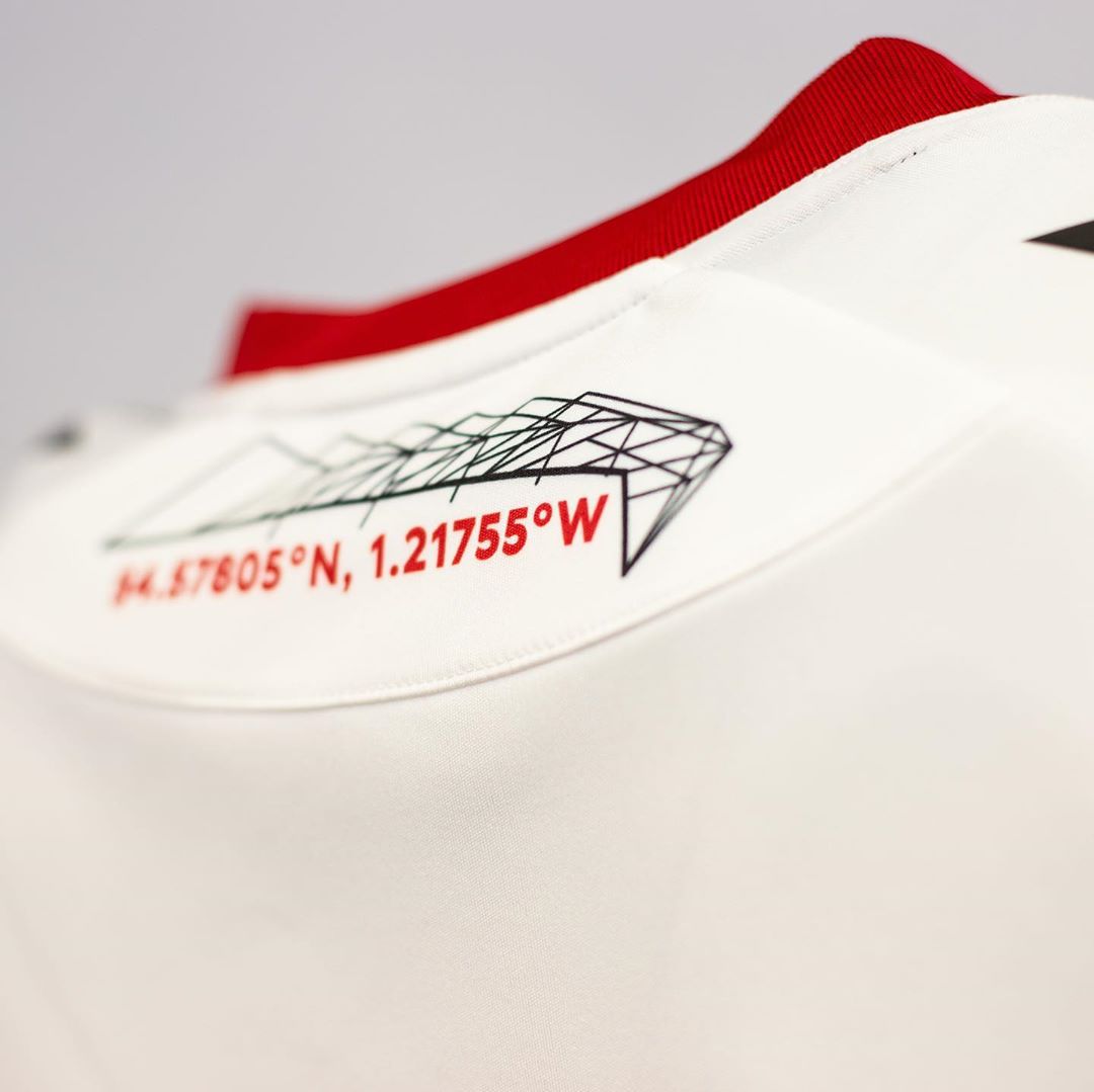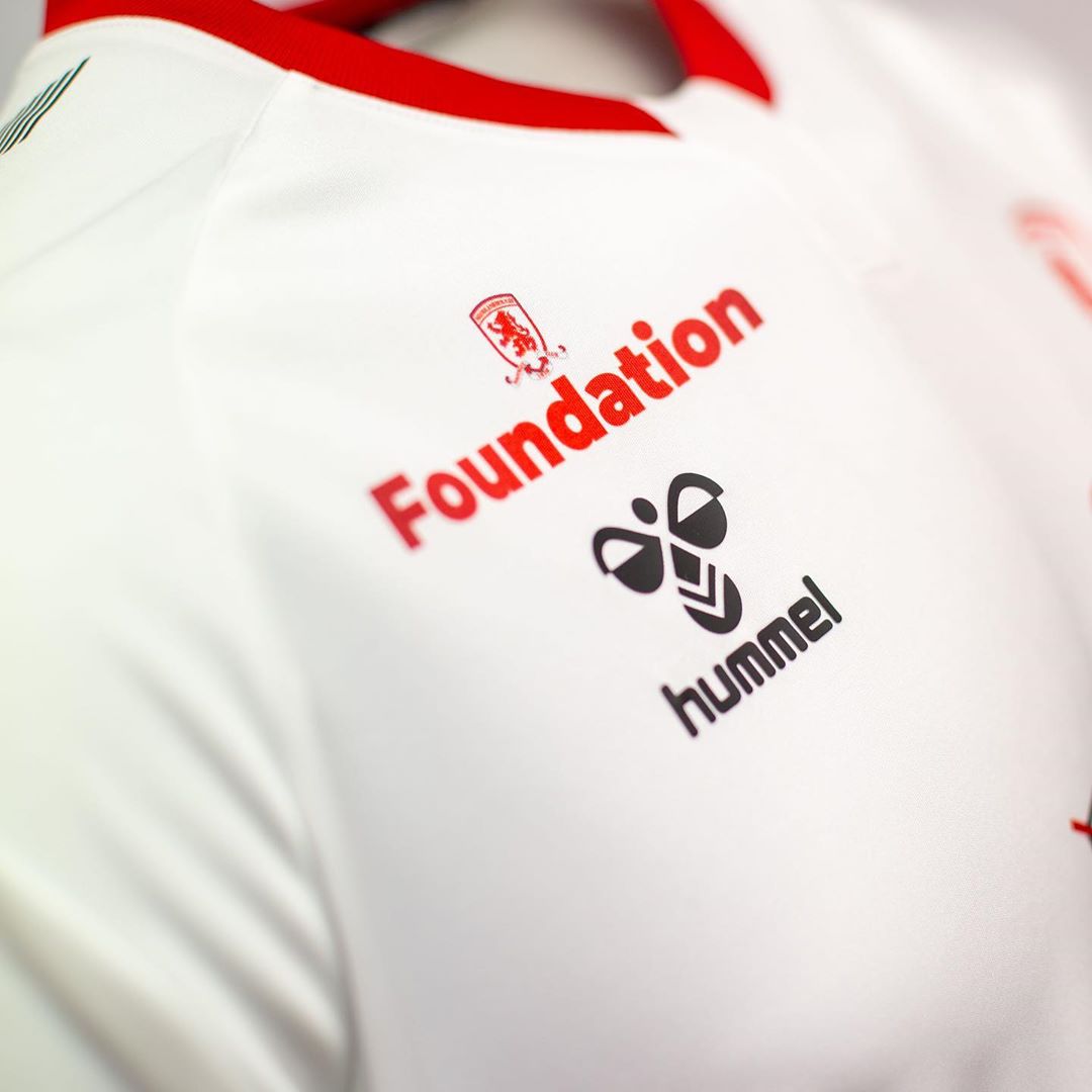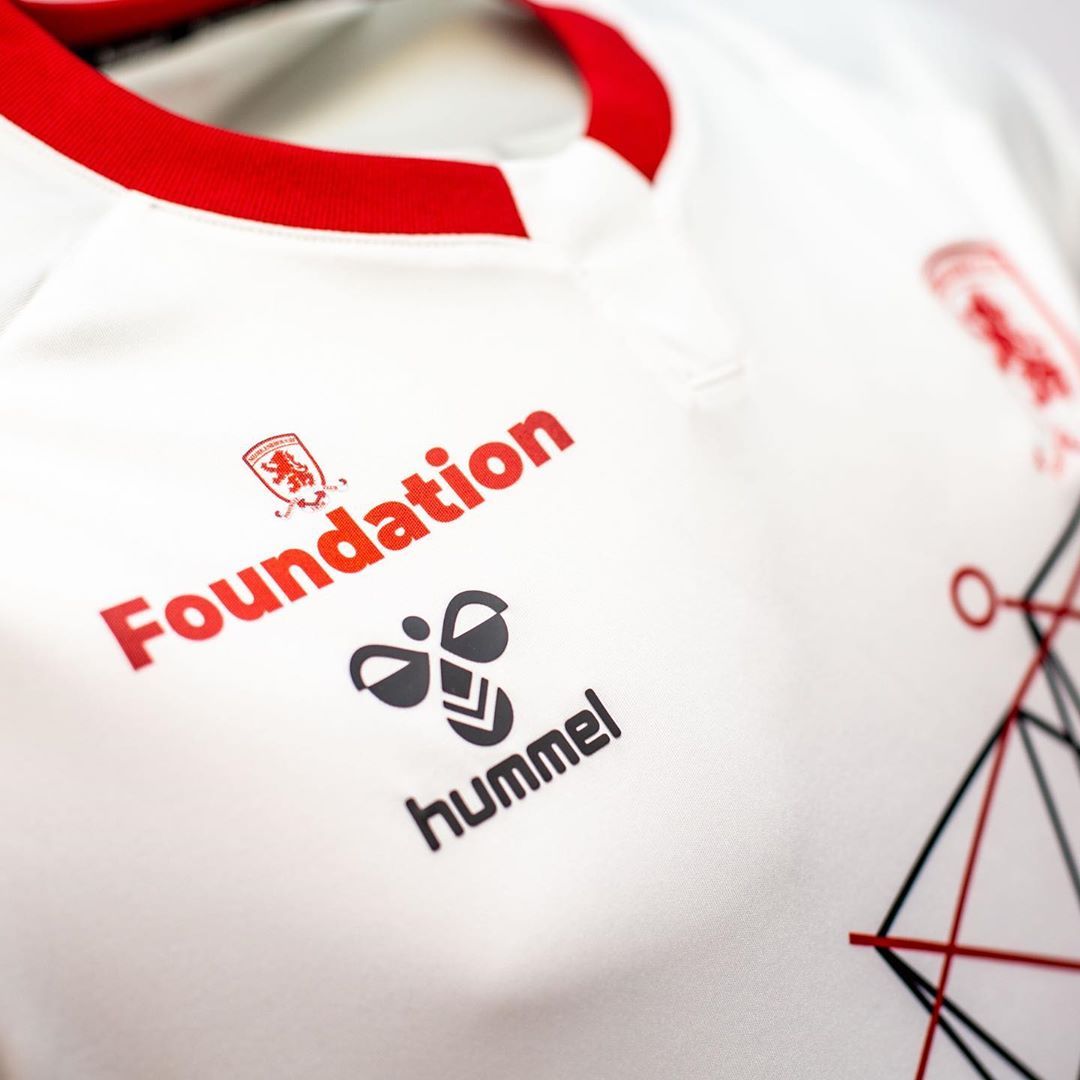 The white color dominates the entire shirt except for the collar and the edges of the red sleeves, although the main verse is the intersection of lines that cut the uniform in two halves. That intersection is precisely the reference to Riverside Stadium and the design of its roof, which in small, is also reported on the back of the collar along with its geographical coordinates. The figure of the stadium took space away from the sponsor in the center of the shirt, who for this special occasion agreed to step aside and go to the back of the uniform. In fact, in front, in addition to the relief of the stadium there are only the coat of arms of boro on the left and that of Hummel on the right, plus, above the latter, the logo of the Middlesbrough Foundation.