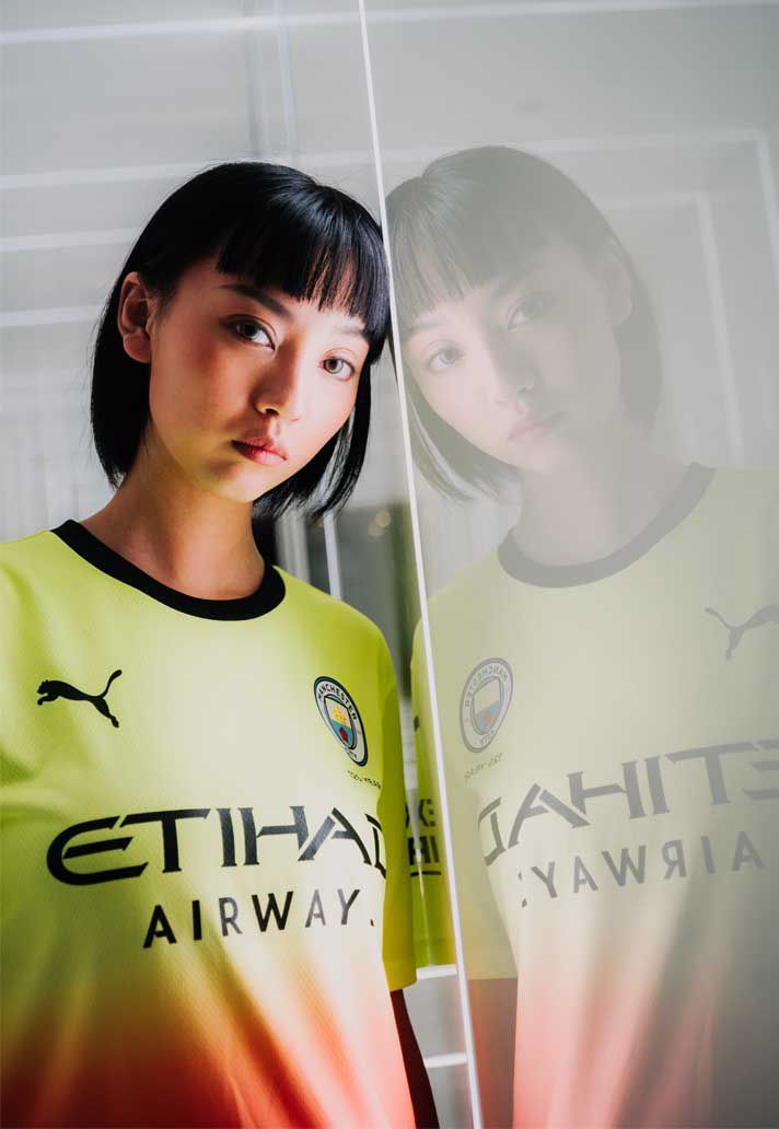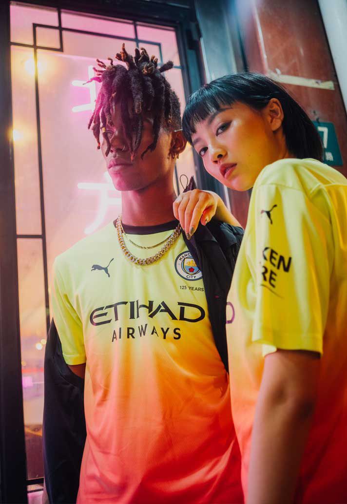 After having publicly presented the new home and away jerseys for the 2019/2020 season the last 1st of July, PUMA has introduced its first third kit for Manchester City new season at a special event in Shanghai, before the arrival of the team for the Asian tournée. The new Citizens' third shirt has an unexpected and vibrant look, coloured and destined to divide the public opinion. After the singular choose for the away jersey - inspired from a night club in Manchester -, the German brand designs a third kit on two tones, a mix between the fluorescent green present on the top and peach-orange on the bottom, with black details, shorts of the same colour of the bottom part of the jersey and green socks in contraposition.