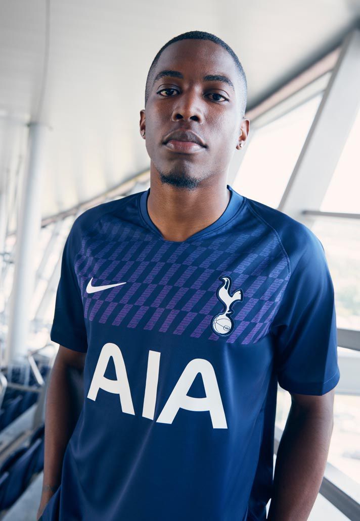 The Away shirt is instead almost entirely navy blue, and in the front (on top, between the neck and the chest, so to be clear) presents a purple zone in which a series of 'SPURS' writing gives life to a jagged vertical striped pattern, something never seen before on a Nike branded jersey. This time, however, the wording 'AUDERE EST FACERE' appear inside the collar, another slogan very appreciated from Tottenham fans. In this case the shorts are blue, as are the socks.