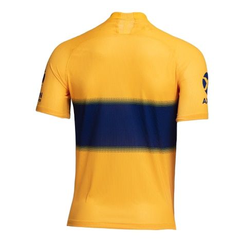 The Away jersey, on the other hand, stands out a bit more, presenting a navy band that goes slightly to blend in the center of the gold-colored shirt. Also in this case, the main sponsor is in the middle and the Nike logo and the Boca crest are represented in the same position as they are in the Home jersey. The kit is completed with yellow shorts and socks. Boca Jrs. already debuted with this jersey on the occasion of the away game against Atletico Paranaense, in Copa Libertadores.