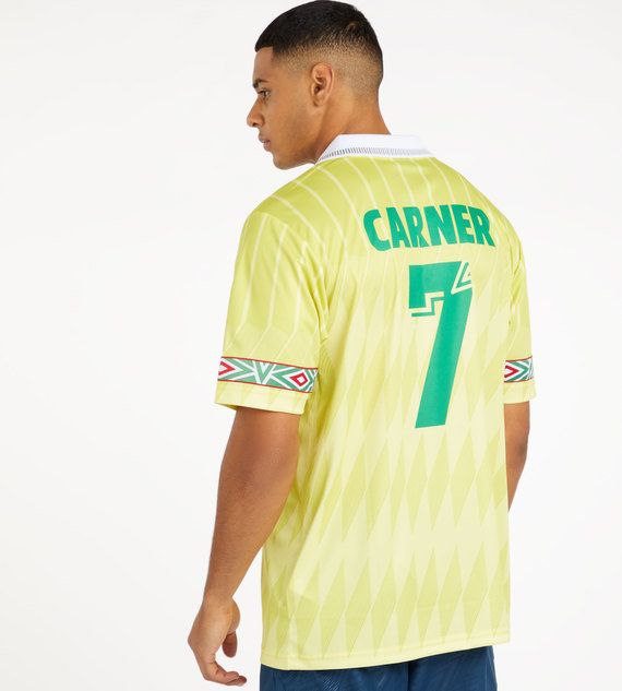 The special 'Guyana' shirt features some details of the Guyanese flag, with a red and green vertical sash running down the front alongside the LCFC logo (referring to the 'fake team' created by Loyle), Umbro Double Diamond detailing on the sleeves and a 'polo' collar to give the shirt a vintage touch. The back of the shirt features a number ‘7’ below the ‘Carner’ name printed with retro typography.
