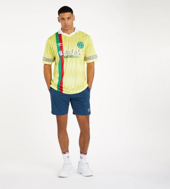 Umbro and Loyle Carner - british rapper who attendet the last Outlook Festival - have linked up once again for this ‘Guyana’ shirt, which pays homage to Loyle’s Guyanese roots on a retro-inspired kit. Loyle Carner recently traveled to Georgetown, Guyana, to work with flautist and composer Keith Waithe at Brutal Tracks studios in the capital city, with the record label’s logo featuring as the main shirt sponsor.