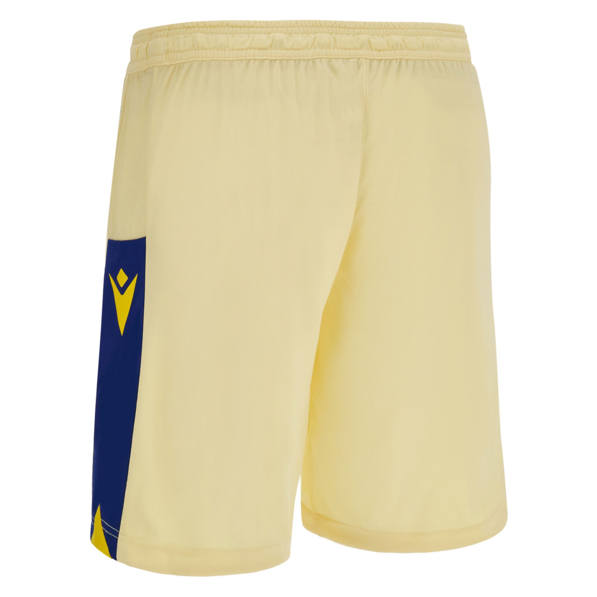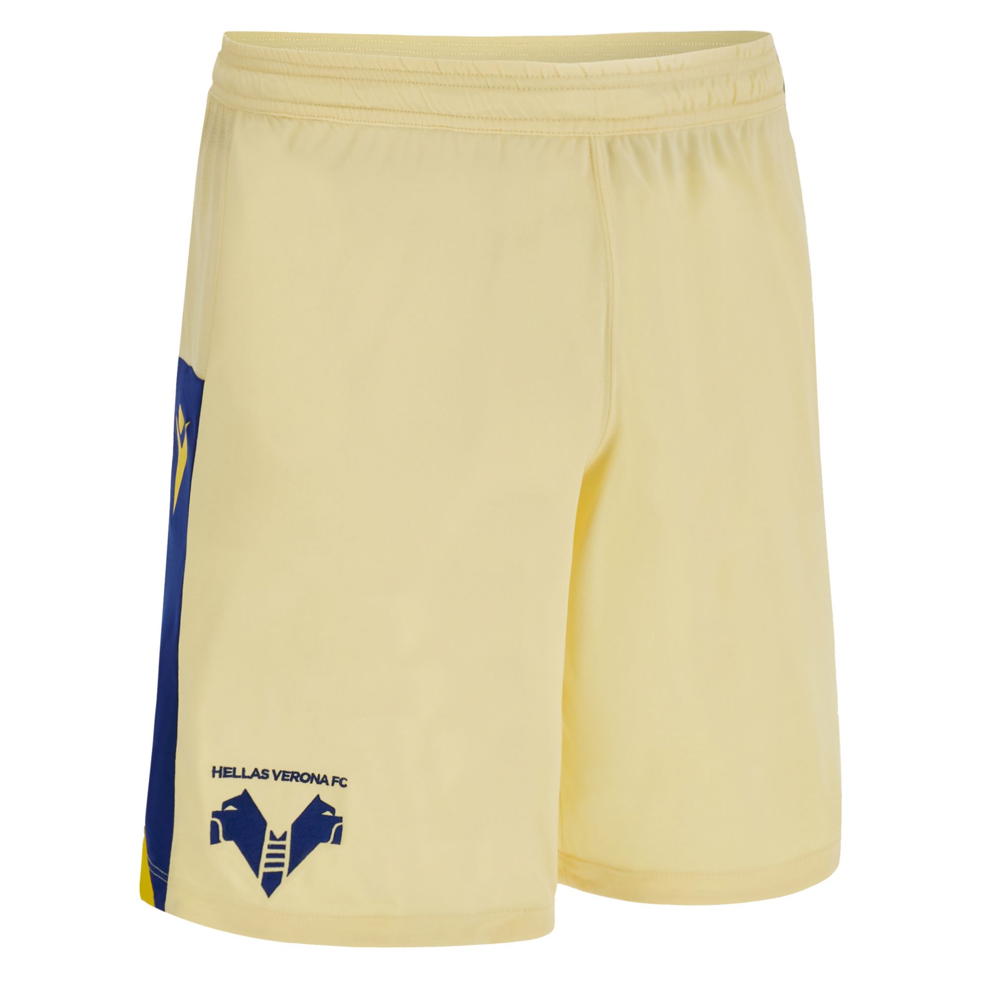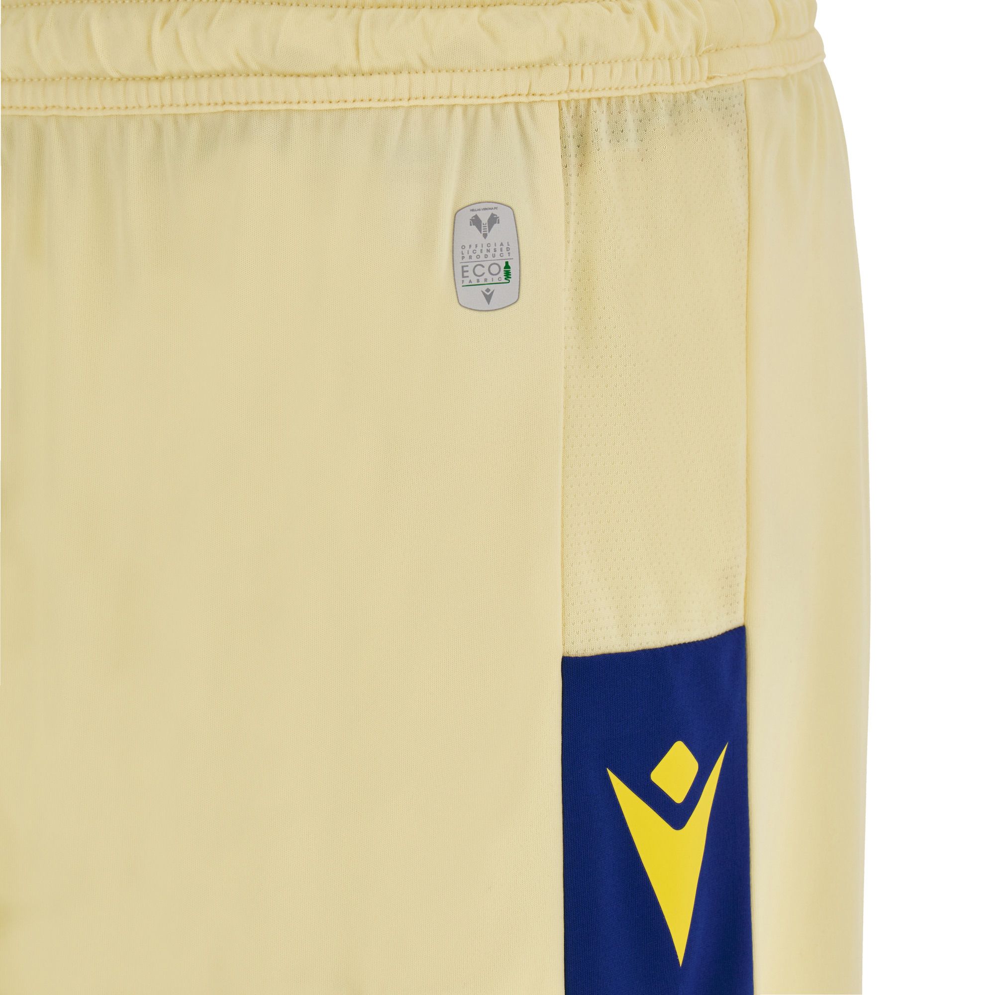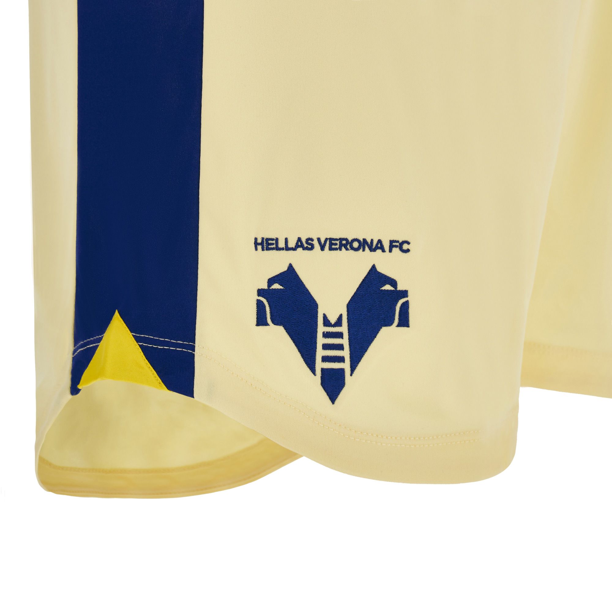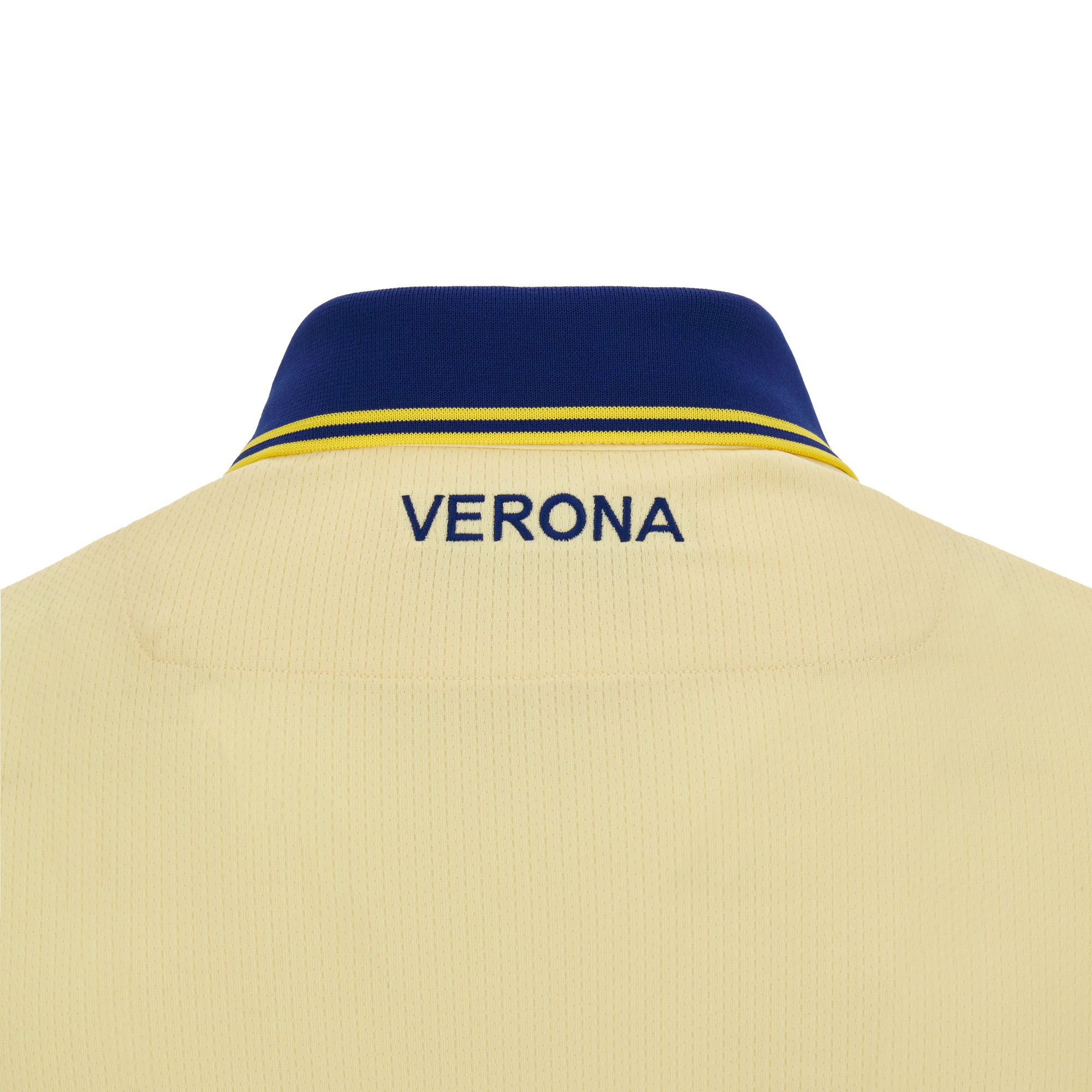 The new Away has a knitted polo collar in yellow and Verona blue. The dominant color of the jersey is beige, enriched with yellow-blue details on the sleeve edges, jersey bottom and in the vertical bands on the sides. The backneck is personalized with the club's colors, its founding year, 1903, and a central cross. On the backneck is embroidered, also in blue, the word VERONA. On the chest, on the right, is embroidered the Macron logo while on the left is the club logo with the two hounds joined at the scale.