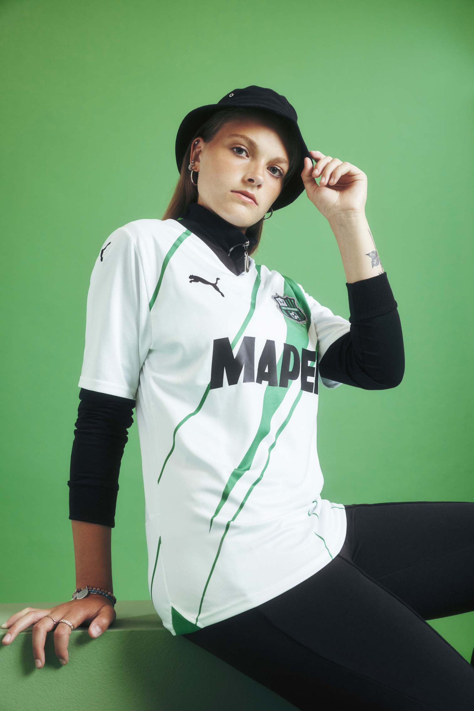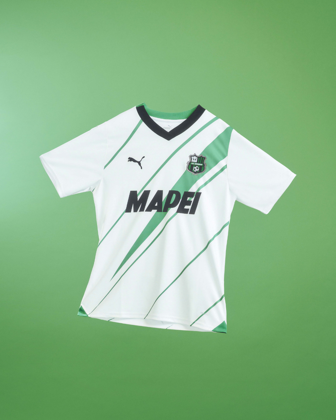 Sassuolo today unveiled its new away kit for the 2023/24 season, produced by PUMA. Inspired by the artistic movement of Spatialism, the new jersey is designed on a white background like a monochrome work on which diagonal stripes in green stand out, reminiscent of clean cuts that break through the fabric and create a disruptive effect for a new aesthetic concept that aims to reveal the club's openness to a new future. The contrasting V-neck evokes Sassuolo's club colours: black on the front and green on the back. The jersey is complemented by white shorts and socks with contrasting green details.