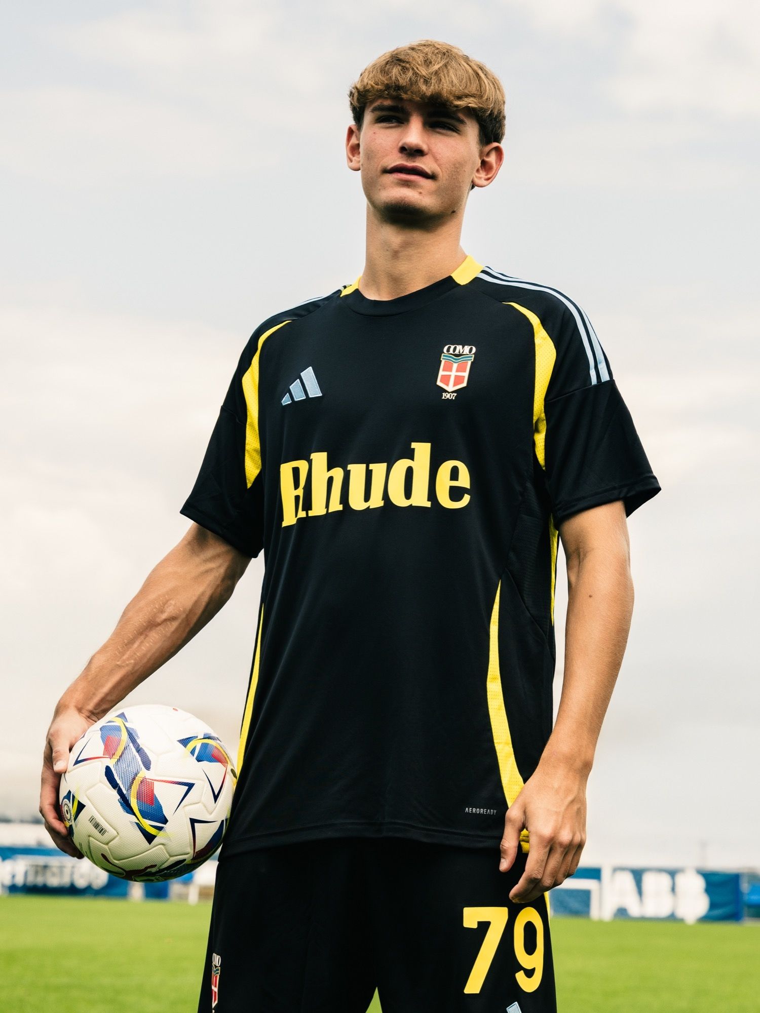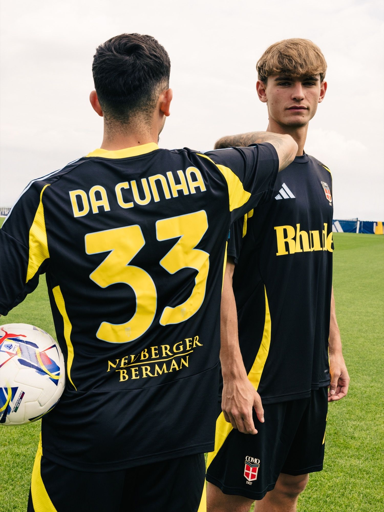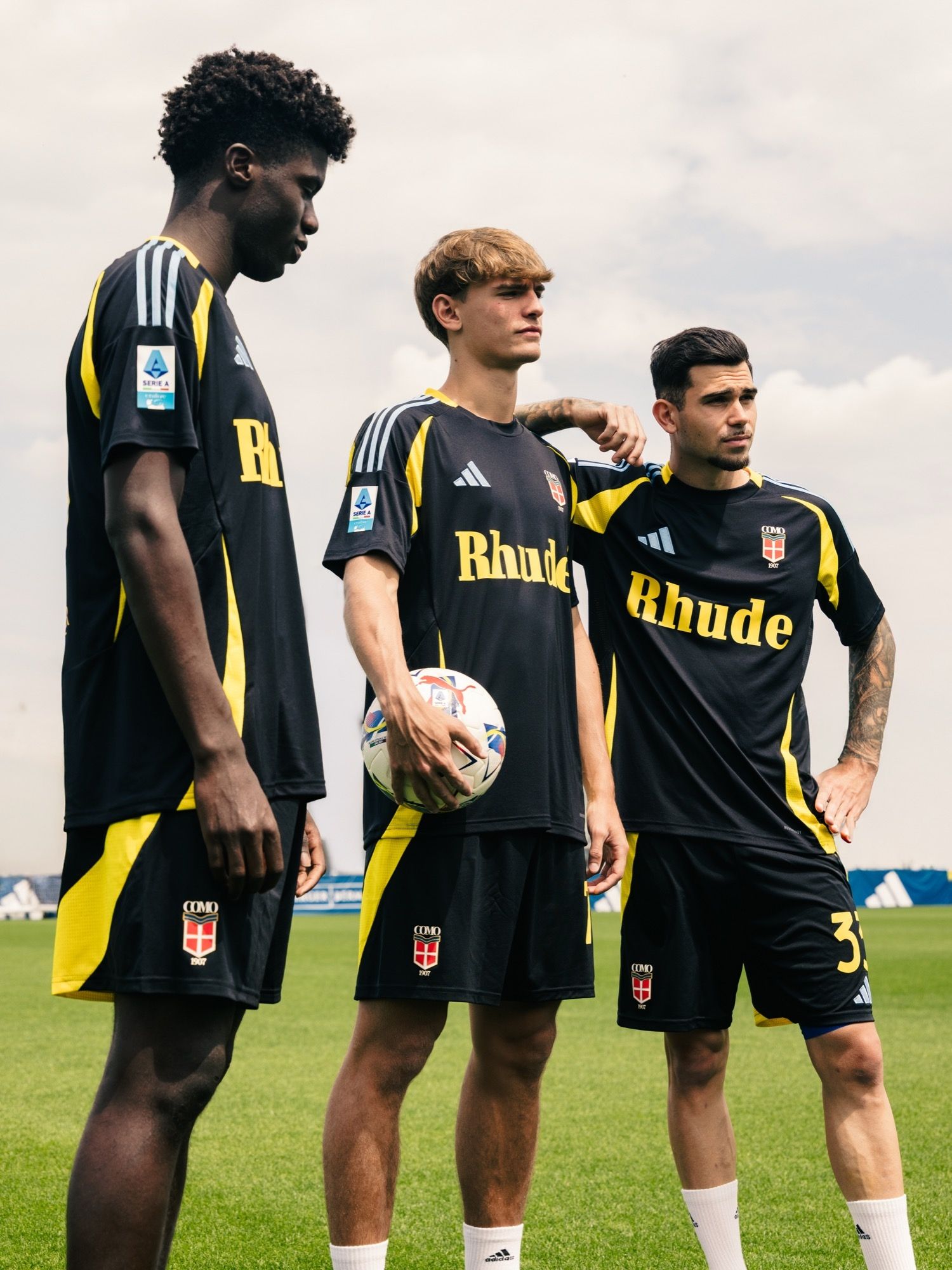 The jersey debuts today, in the final match of the 2024/25 season against Inter. Made in black with gold detailing, it features RHUDE branding. On the front, the RHUDE monogram appears below the Como crest and the adidas logo. On the back, the number 24 beneath the word COMO celebrates the club’s return to Serie A. At the bottom, a bold statement: LAKE COMO – LOS ANGELES.