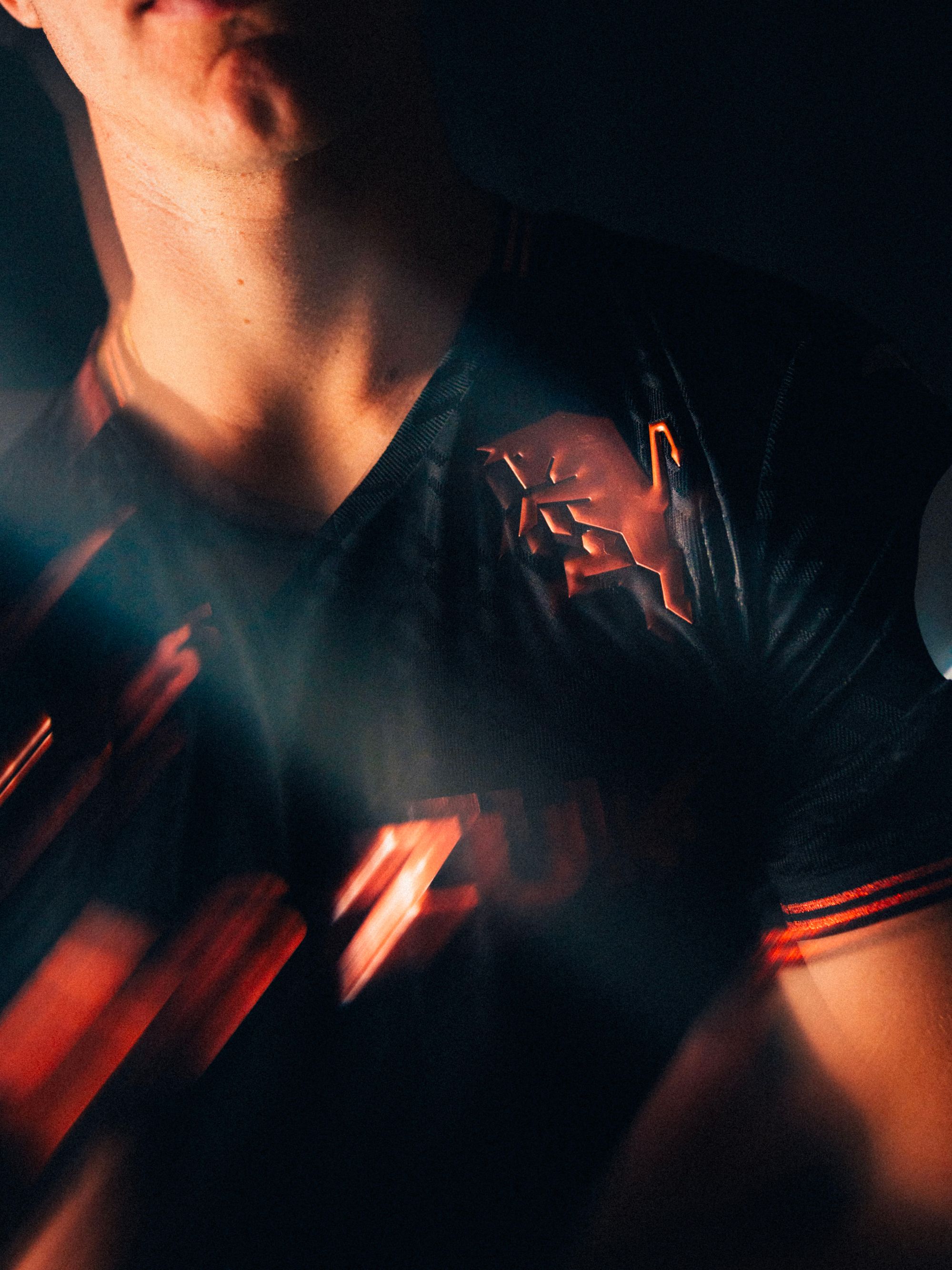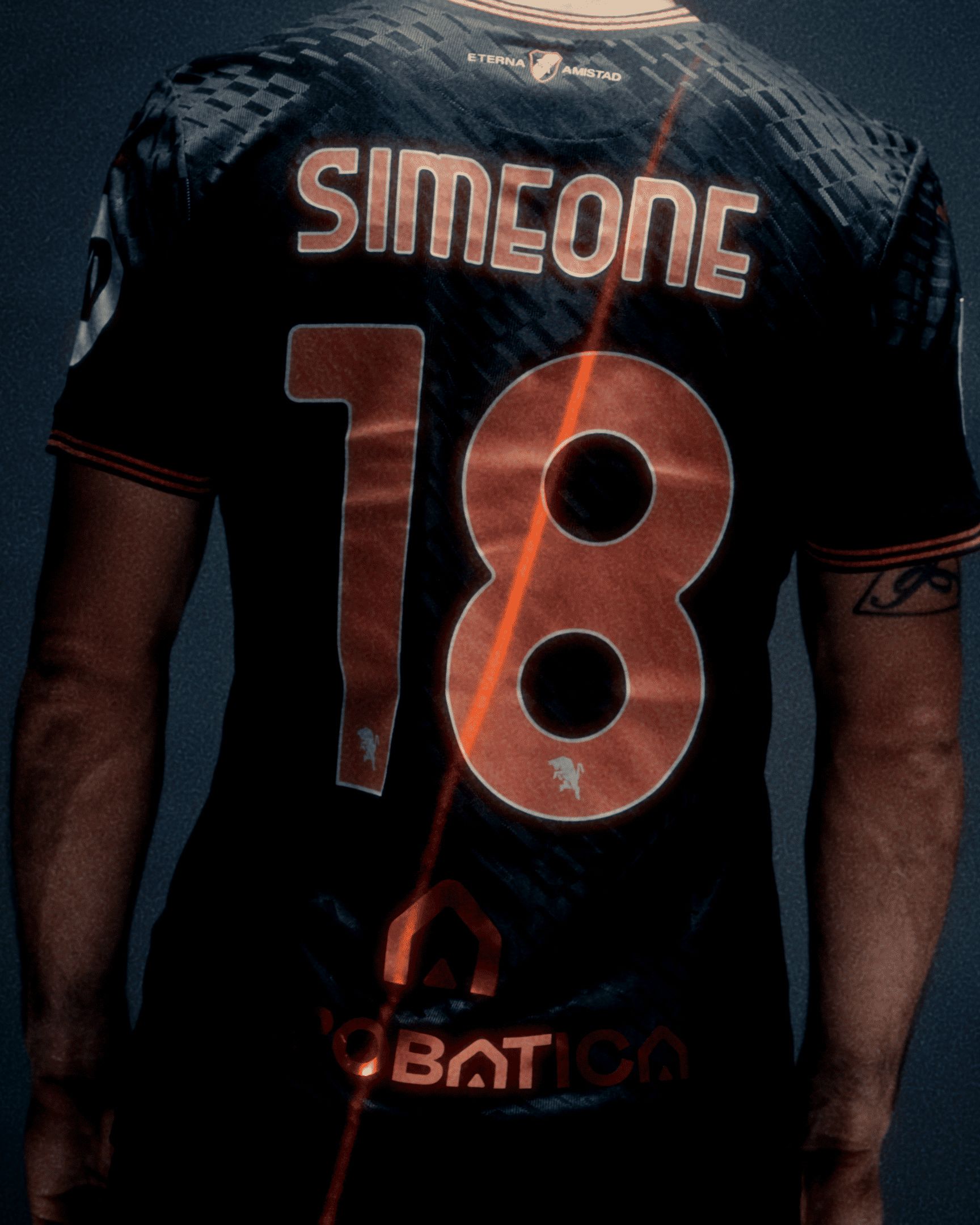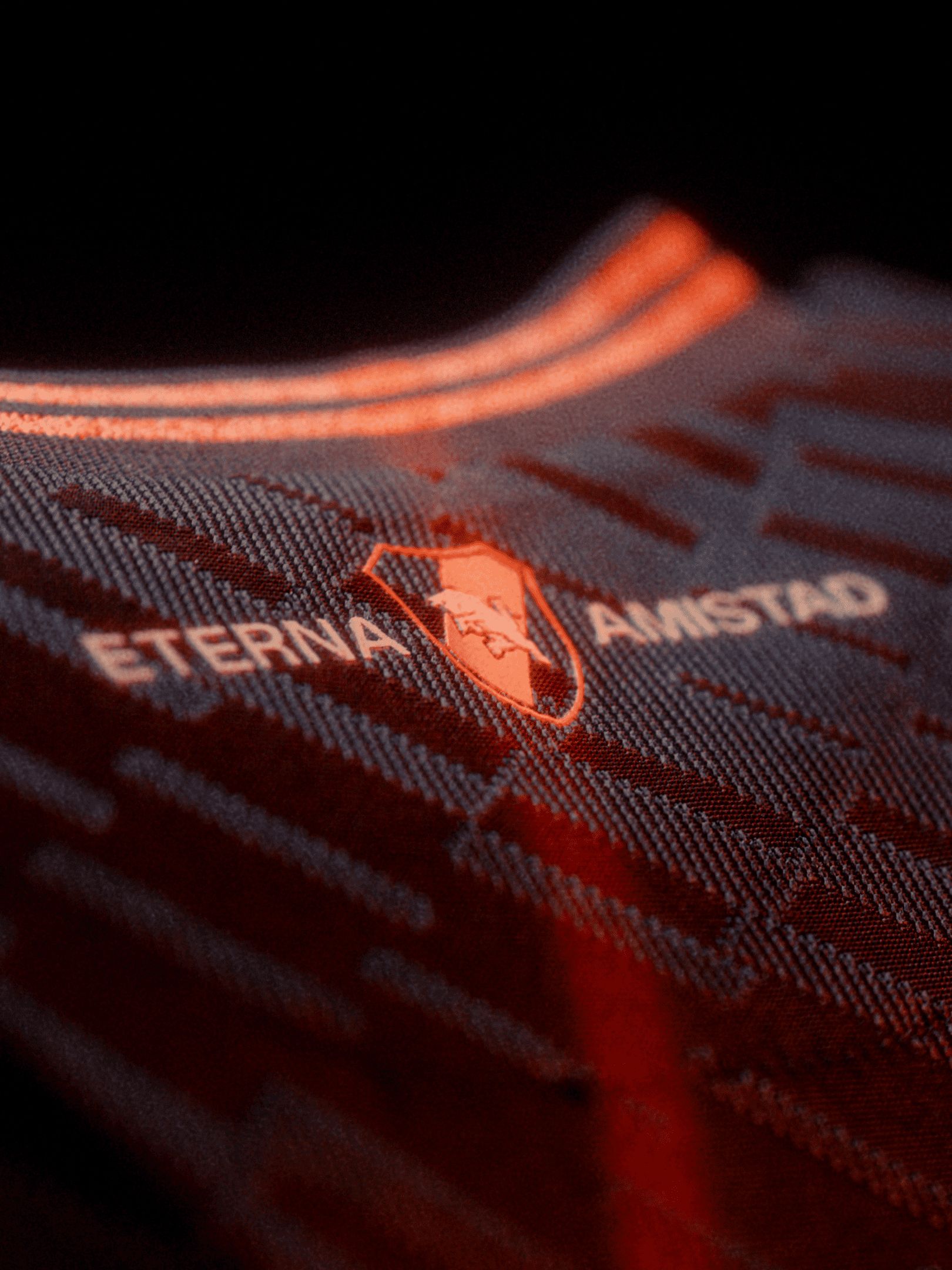 Two other high-impact aesthetic details catch the eye. The first is the geometric pattern that runs across the entire jersey with a glossy effect that breaks up the solid color while at the same time enhancing it. A play of shapes and tones that enlivens the shirt without erasing that dark patina that makes it special. The second detail concerns the bronze — the tone used to color the details, including the rampant bull logo applied in silicone, and to provide a final touch of elegance to a jersey that celebrates a friendship that knows no borders.