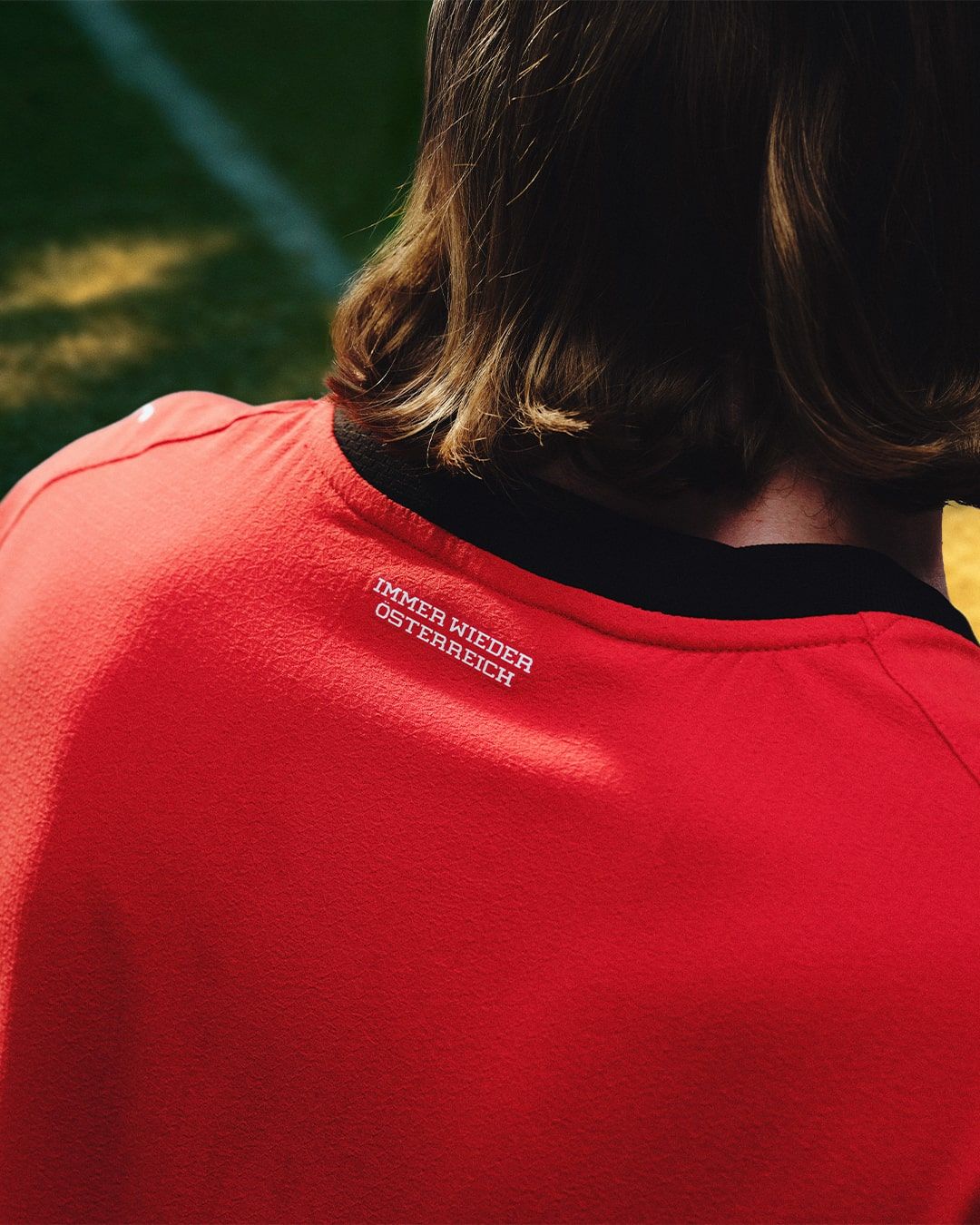 After 28 years, Austria returns to the World Cup with a kit that features a bold and modern design. The jersey stands out with an intense dark red base in stark contrast to the black sleeves and shoulders. Thin red details on the sleeve edges add a touch of clean aesthetics. On the chest, the Austrian national crest and the PUMA logo, both in white, stand out, giving the shirt a strong identity focused on performance. The collar is made with a simple crew neck.