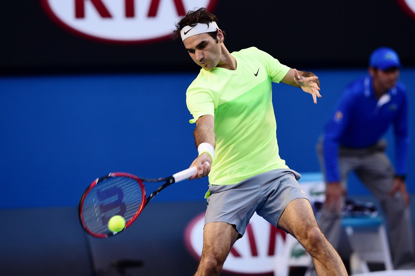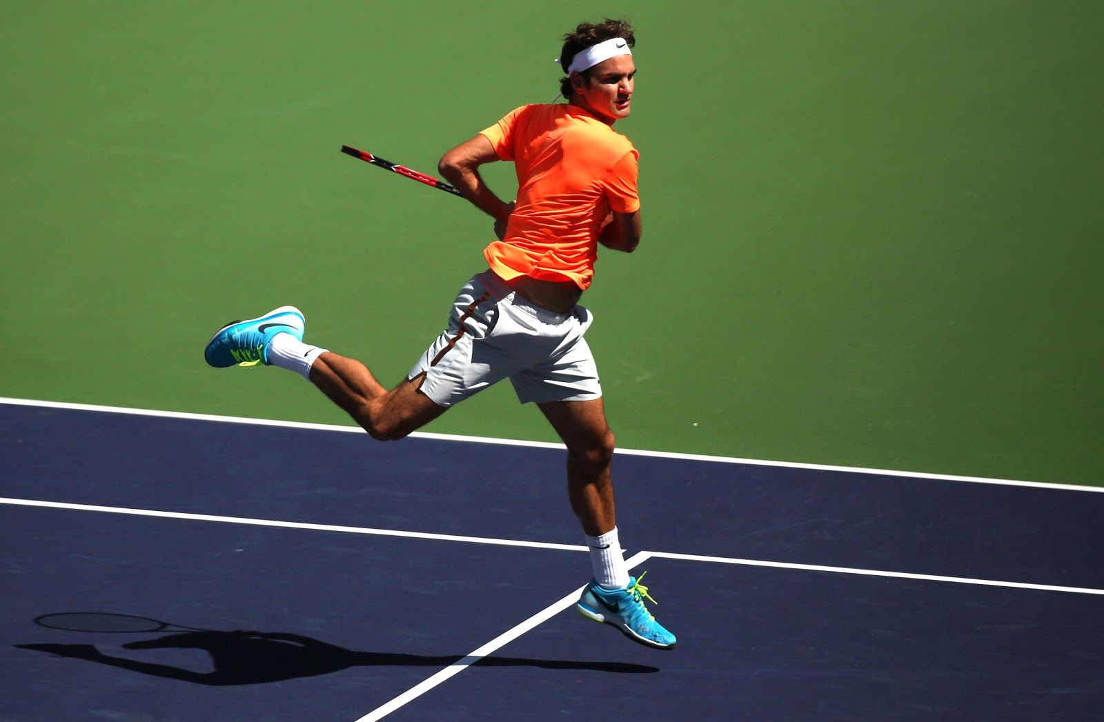 Federer knows how much effect the ball has, indeed once it would have touched the ground He would have not reached it anymore. So he decides to hit it with stretch up vole and a splits; He also can turn the effect on his side: the get back ball touches the floor and bounces low and horizontal. But the Serbian guy is a known physical prodigy, he gets back and he also makes a wonderful shot headed to Federer’s behind. Federer has to turnaround not completely in back, because Nole has closed almost the Federer’s whole view, so the Swiss guy needs to know where he has to shot the ball.