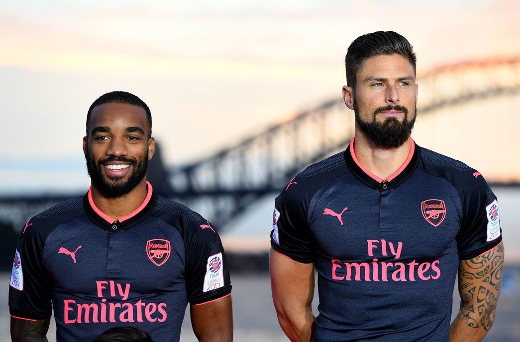 During the summer tour that is taking place in Australia, Arsenal presented the third kit by Puma. It immediately draws attention the choice of sponsors and numbers' colors: a bright pink that stands out in the dark gray that extends throughout the rest of the uniform, including shorts. The solid gray on sleeves turns melange on the bust.