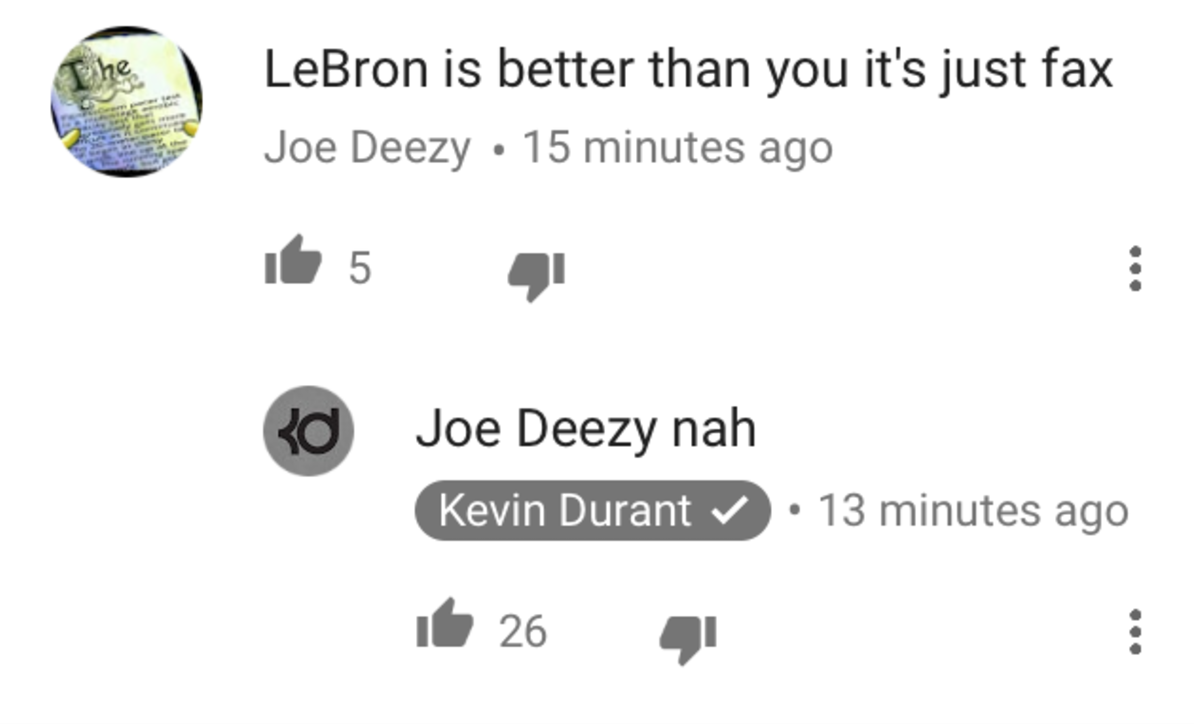 The comment by Joe Deezy was not answering KD’s question but instead stating the old comparison with The King, which has always been a soft topic for Durant. The Finals MVP replied with the same class of one of his jump shots, with just three letters: “Nah”. YouTube is a news for KD, which used us to great social media performances in the past years on Twitter and Instagram, although the first one remains his favorite social. Between a bunch of tweets, some of the most memorable are: when he tweeted about History Channel and the sun, the Scarlett Johansson’s bath water and about the depression when no one texts him.