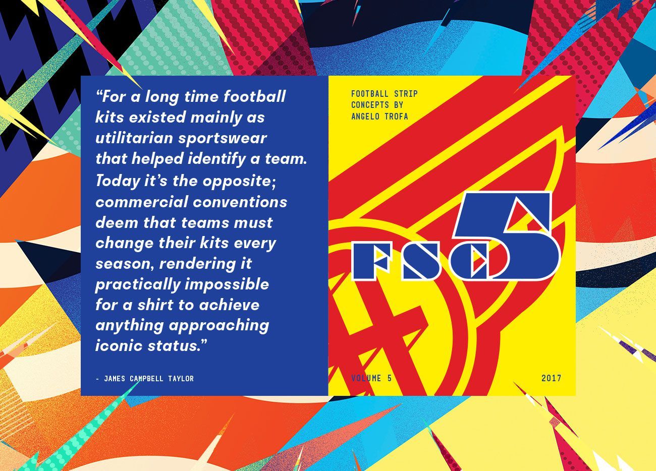 Football Strip Concepts was originally started as a personal project by the London-based designer Angelo Trofa to showcase concepts and act as a portfolio with the aim to get into the industry. Now Trofa just dropped the fifth issue of the magazine: 80 pages of articles, interviews, and insights about football kit and jersey design.