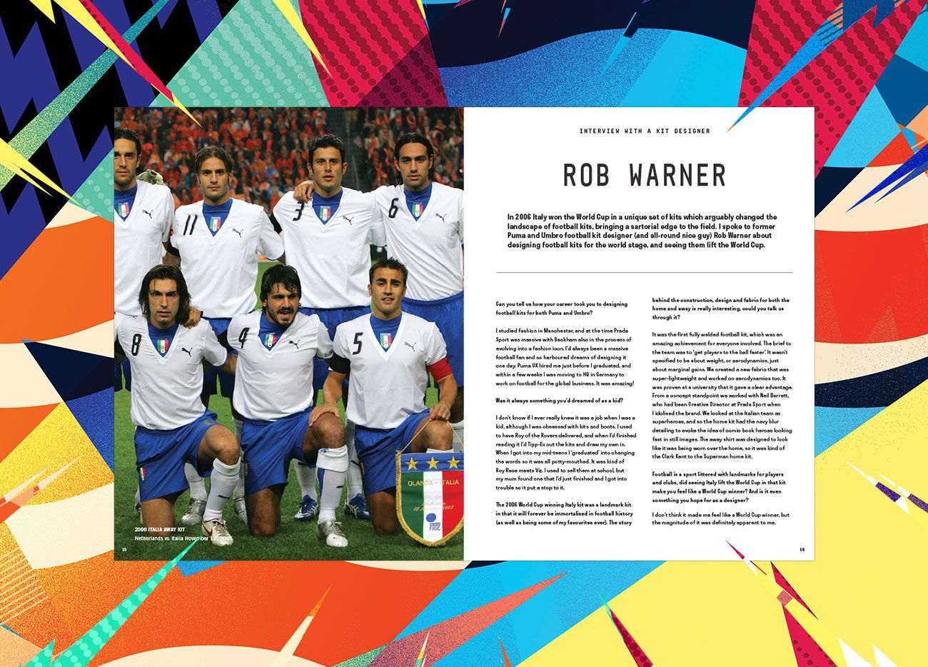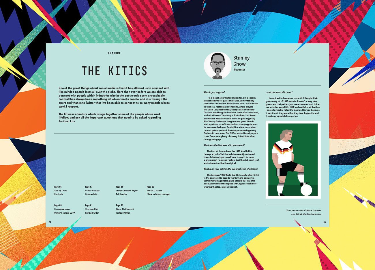 This issue features for the first time designs which have been brought to life, both in the real sense and virtual reality, having been approached by EA Sports to design kits for FIFA17 and FIFA18. This is also the first issue to feature full editorial pieces, with a range of articles from interviews and features which are all centered around the art of the football kit. In the issue - fo instance - there is an interview with 2006 Italy World Cup kit designer Rob Warner, another one with the famous illustrator Stan Chow as well as BeInSport commentator Address Cordero and Sheridan Bird. This issue also takes an in depth look at a football collective built up of artists changing the landscape of the underground football scene in Paris and the most interesting kit collector on Instagram.