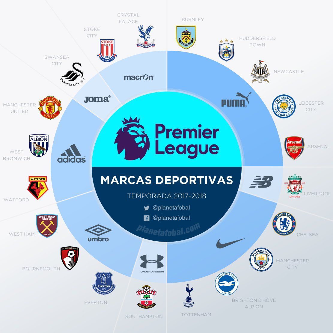 In the 2017/2018 season there will be just eight brands on the Premier League's pitches, two less from the last season since Drywolrd - Watford's technical sponsor - declared bankruptcy and FC Bournemouth replaced JD with Umbro. Puma has the most teams, Nike earned three more teams compared to last season when the swoosh was just manufacturing the Manchester City's kit. The big loser of this year is adidas that lost Chelsea in favor of Nike and has two teams relegated in Championship (Middlesbrough and Sunderland).
