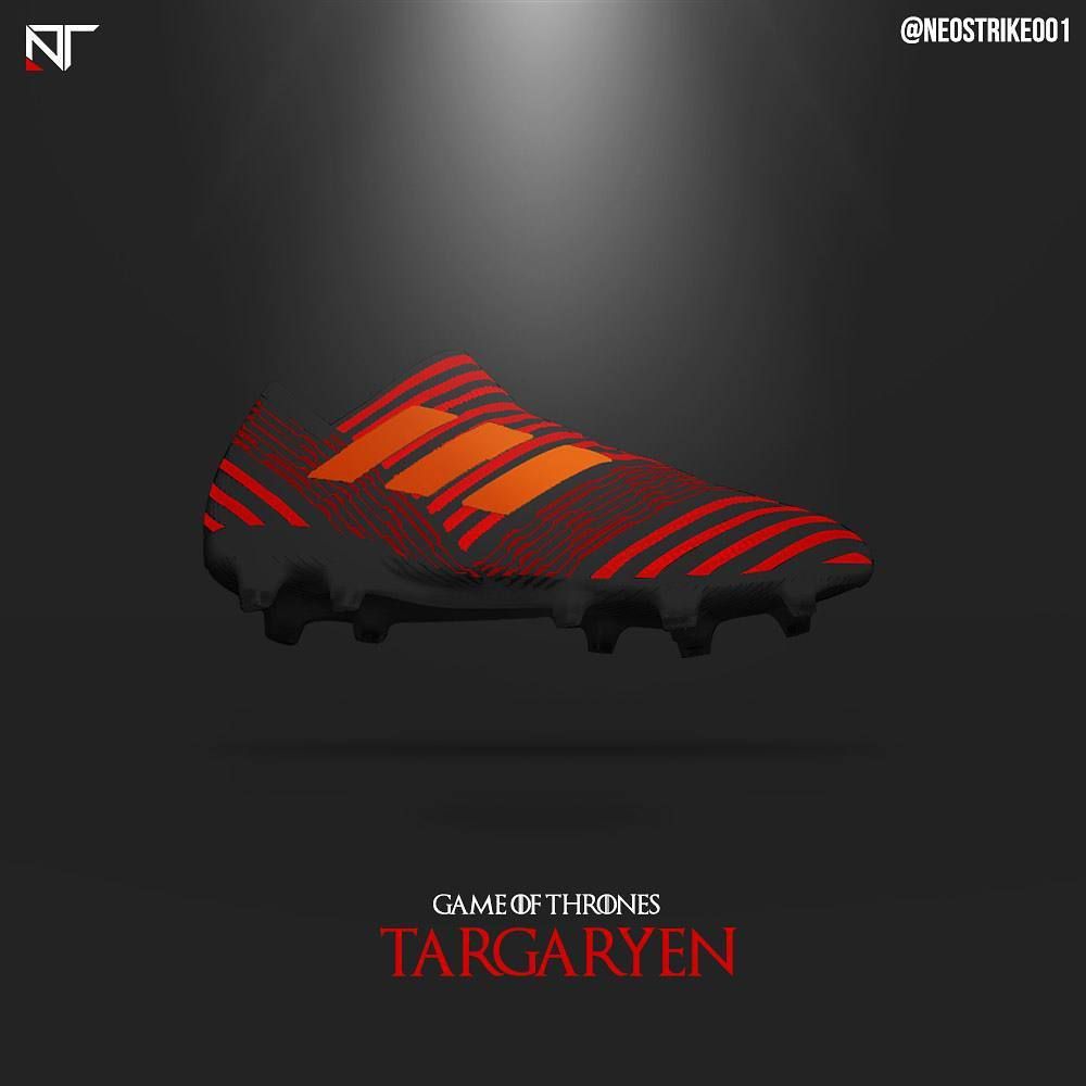 For the houses of Stark and Targaryen Thomas picked adidas. For the kit inspired by the lords of Winterfell, Thomas' Adidas Stark X 17+ Purespeed concept boasts the symbol of Stark, a grey direwolf, on the upper to stand out, while his Nemeziz concept cleat combines different shades of grey, creating a clean look. Instead are black and red with dragons' details, the Adidas x Targaryen concepts remind of Adidas' Pyro Storm collection. For the Lannister collection Thomas picked Nike instead