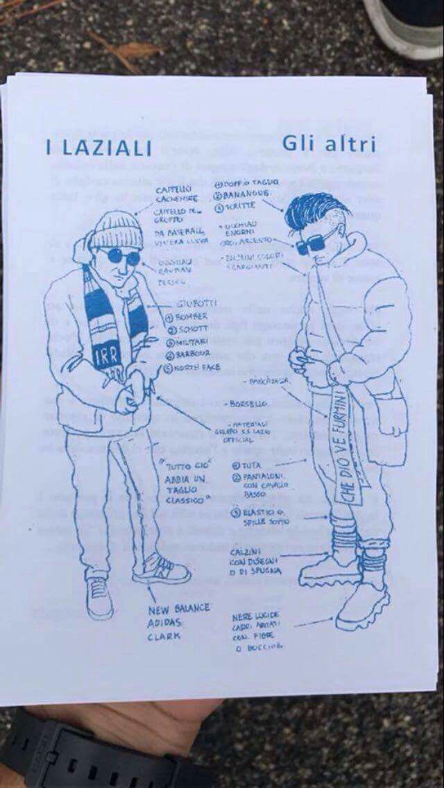 The leaflet is a pamphlet of style that every biancazzuro has to follow - the sector of Ultras' in the Olympic Stadium - to distinguish Lazio's fans from the "others" especially the Roma's fan, known to be their trash style. Starting from the shoes: Clarks, New Balance and adidas are ok, lucid shoes and studs are forbidden. For the trousers, every classic cut is accepted, while suits are strictly not ok. For the jackets the cool brands are The North Face, Barbour, Schoot, the military jackets and the bomber style.