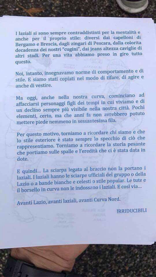 Lazio's ultras always had an inclination for the British and casual culture in the stadium. The main ultras group that led the Curva Nord from 1987 to 2010 were the Irriducibili, that borrowed the look and way of supporting from the English hoolingans. They revolutionized the way of living the stadium in Italy: from the chorus without the drums, to the style, referring to the British casual fashion. On last Lazio game the ultras group - despite they are not in charge anymore - has distributed a leaflet with a set of style rules that the fans have to follow when they go to Curva Nord (the ultras sector of Stadio Olimpico). The style is important, beacuse, as they write: