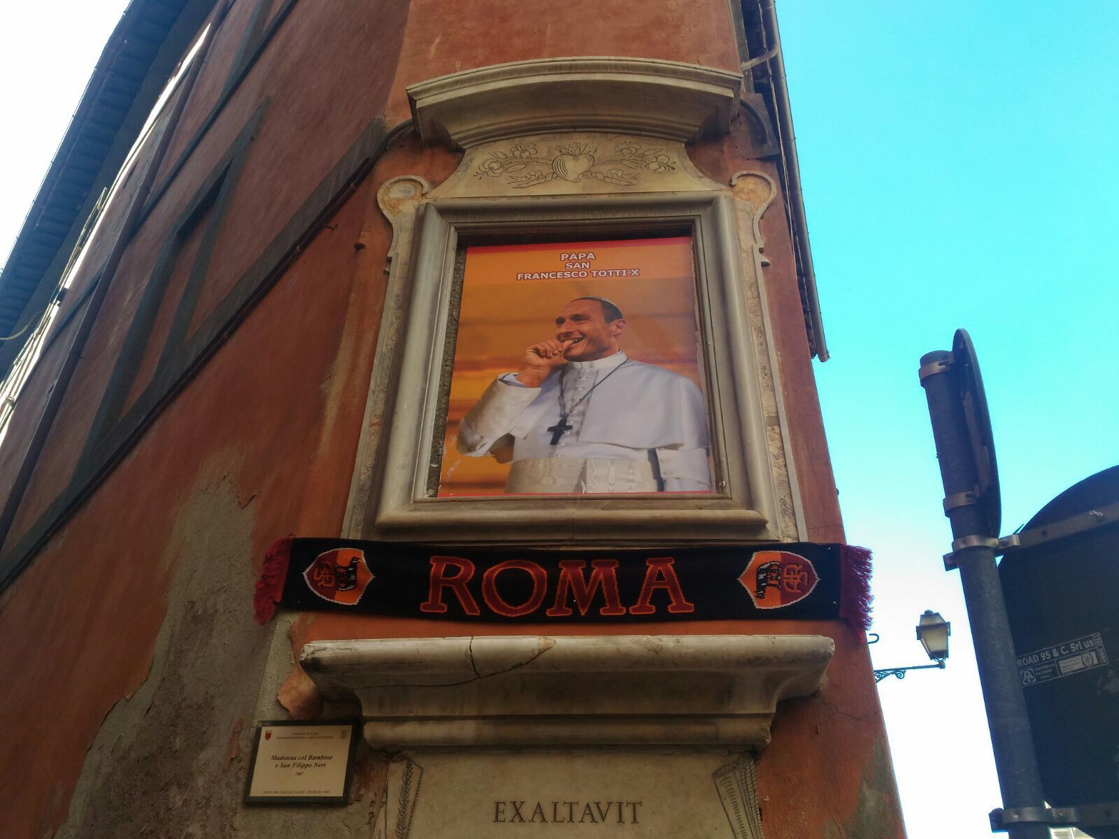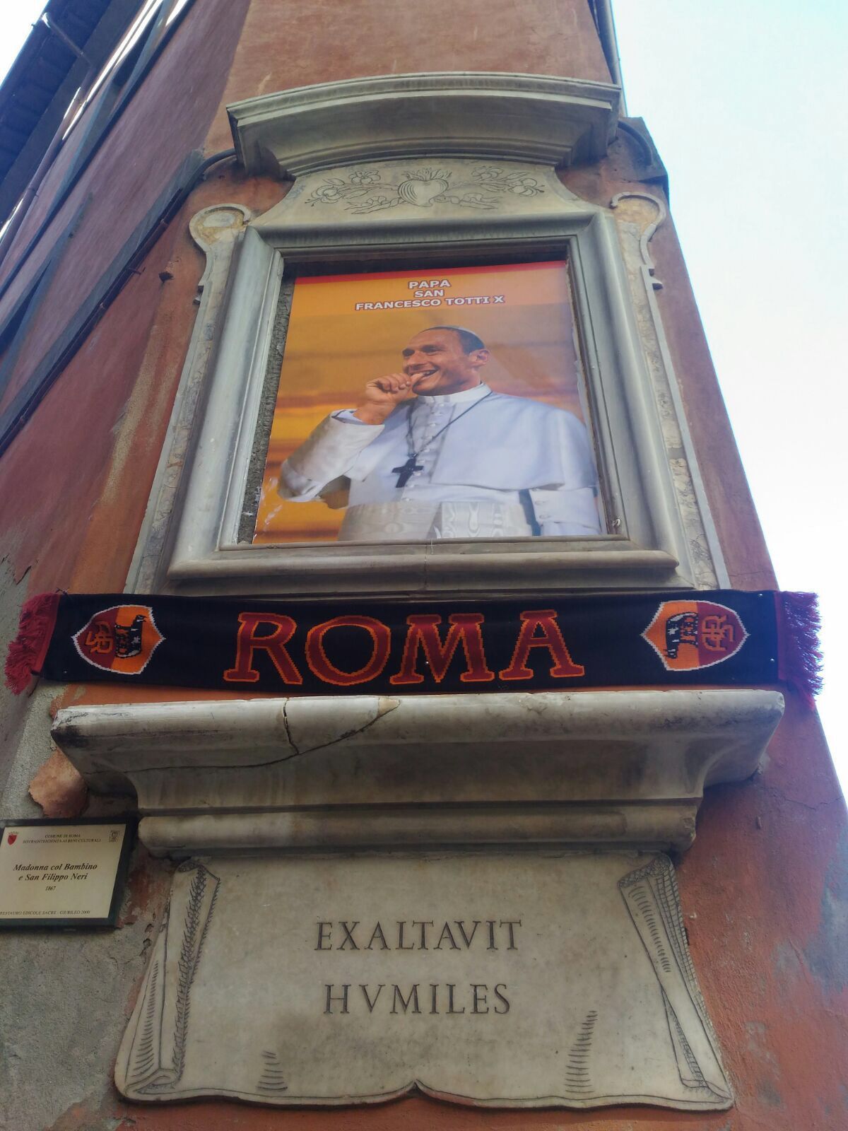 Today this picture of Francesco Totti with papal clothes appeared in a corner between two small streets in the historic center of Rome. In the picture, the former Roma's captain is portrayed with his inch in his mouth as his typical scoring celebration. The picture appeared 500 meters away from the Vatican City, where the real Pope Francis lives, who knows how he takes it. The workart is anonymous, the first one to post the image on the social network was the journalist Andrea Purgatori.