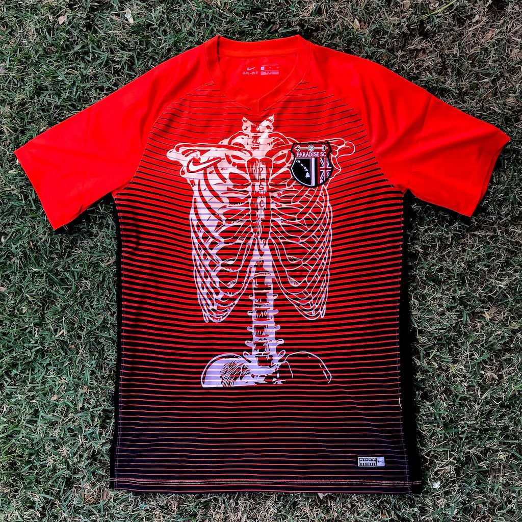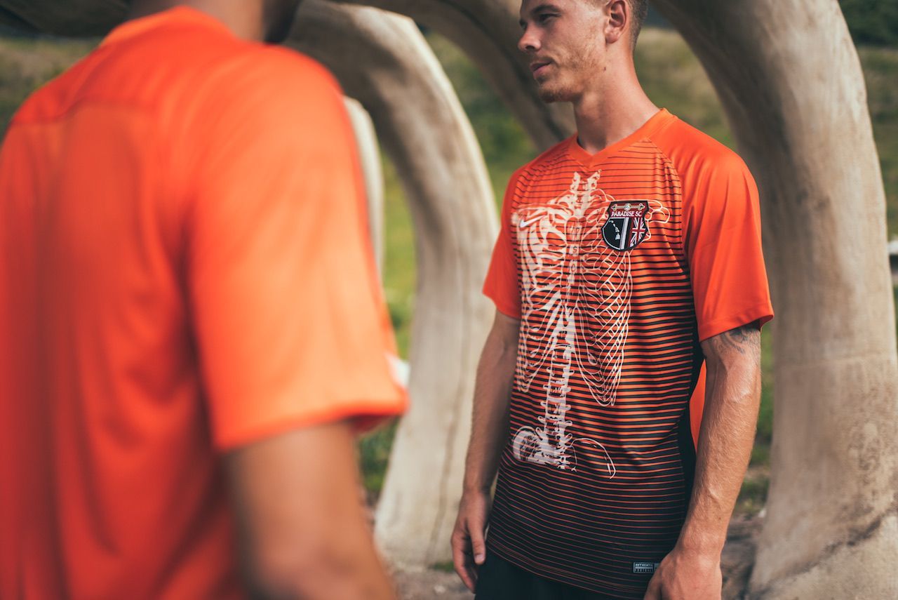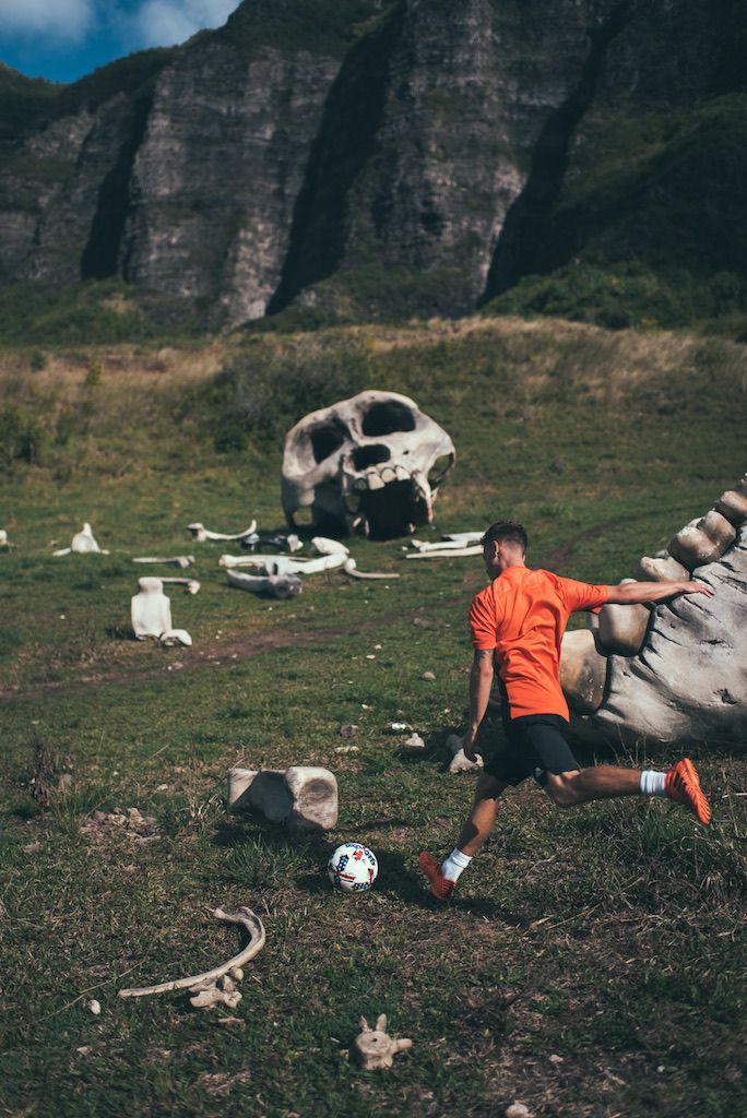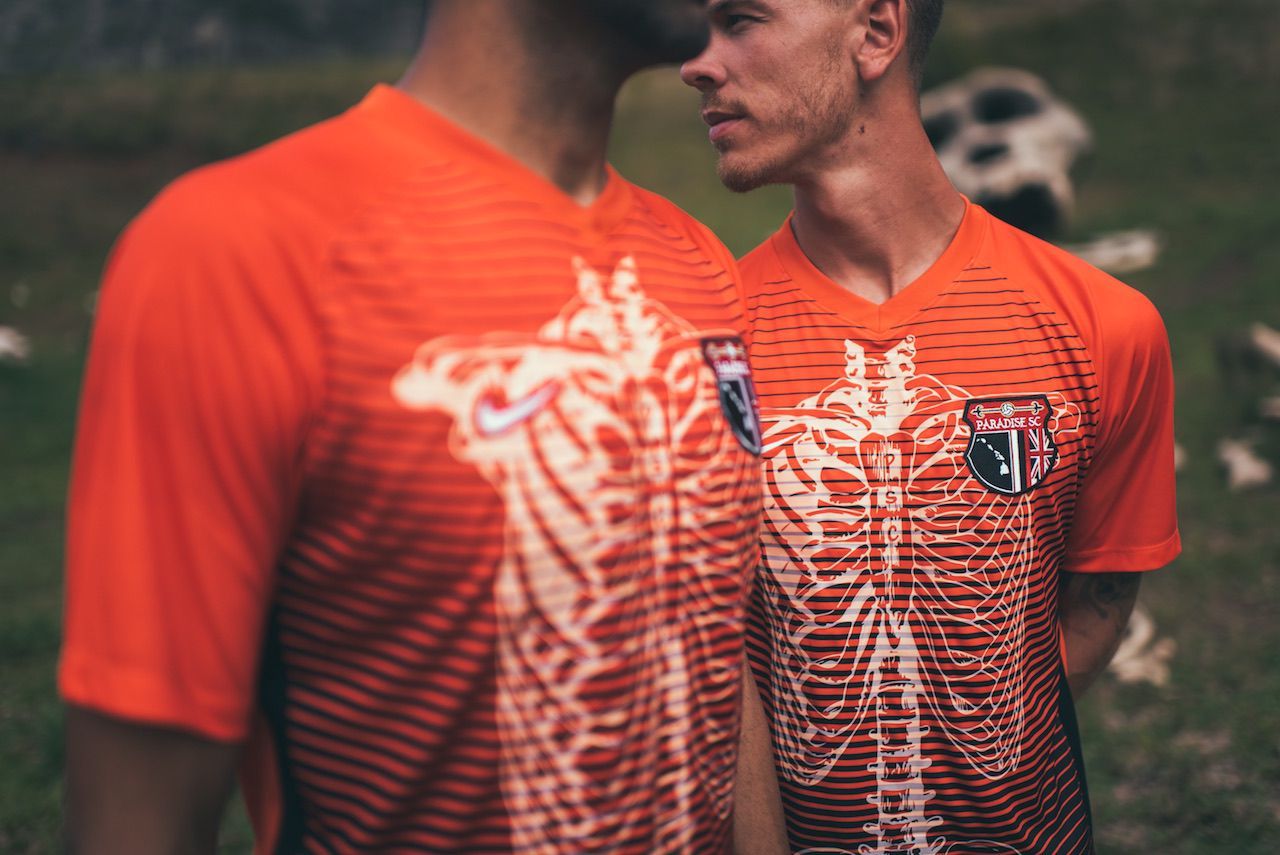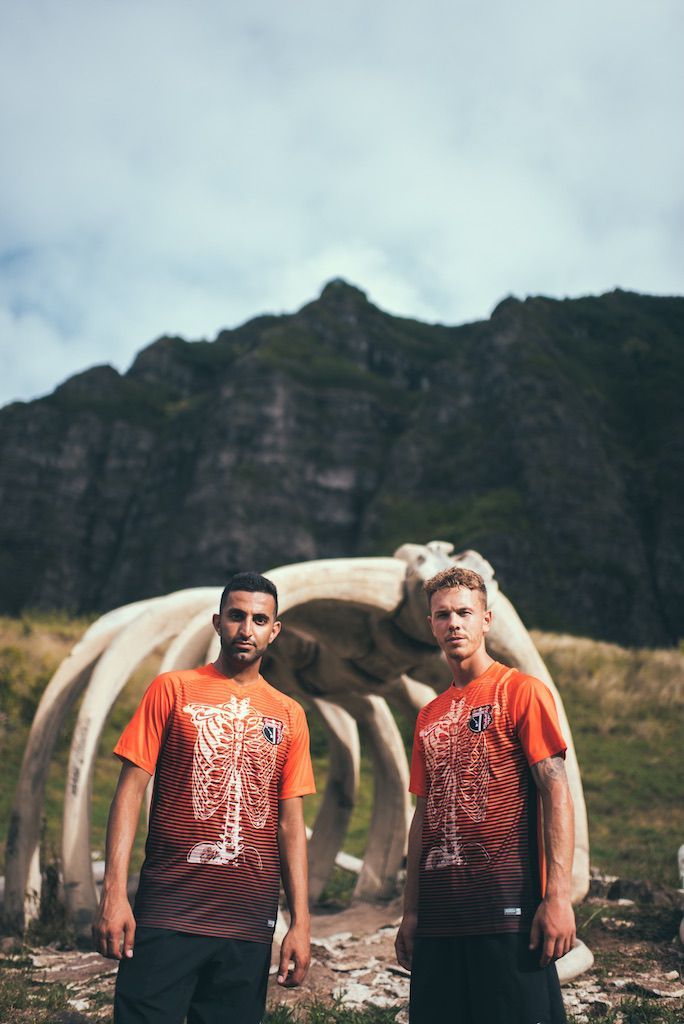PSC’s latest production, in fact, is realized in orange and black, with a glow-in-the-dark human skeleton graphic. The Nike logo and Paradise Soccer Club crest complete the shirt, that will undoubtedly make you shine (well, literally) at your Halloween party with your friends. And to stay on topic, the jersey lookbook has been shot at the Kualoa Ranch, on the Oahu island, that would be the set of movies like Jurassic Park, Godzilla, and Kong: Skull Island. The two protagonists of the shooting were two tekkers, Strkr FC and Mo Ali. So, we challenge you to think of a better costume for the night of October 31.