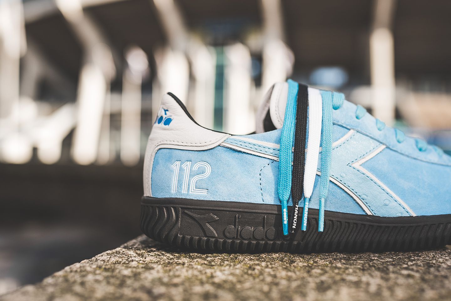 Diadora took the shoe to another level with some small and incredible details. On the heel, the number '112' is shown to remember the minute in which John Hewitt score the winning gol. Both the footbed and tongue backer are leather laminated and a rain pattern is printed on the insole to depict the weather on the night of the Final. Each pair also comes in a custom box and dustbag with 3 lace sets to go with it.