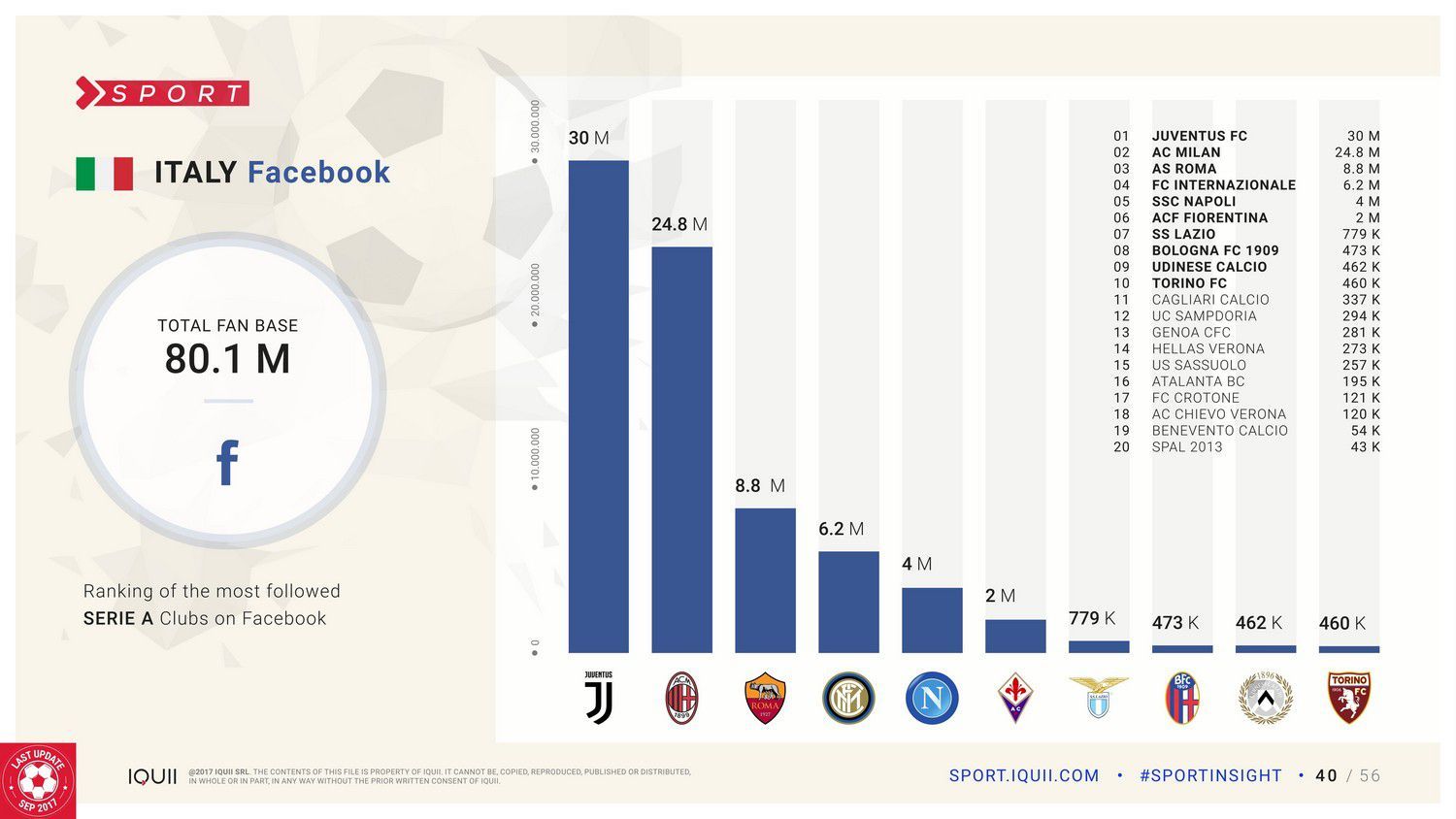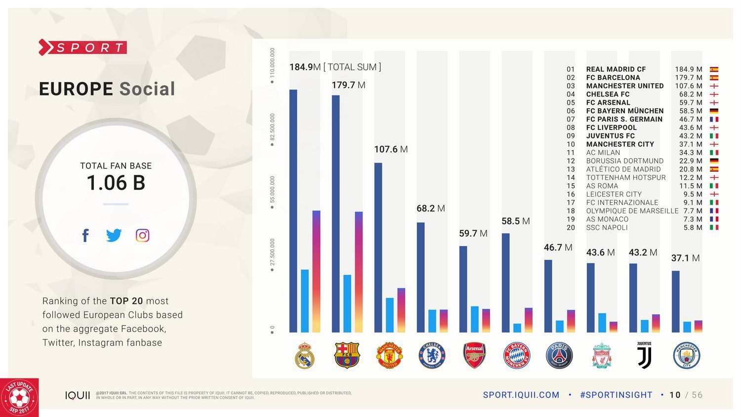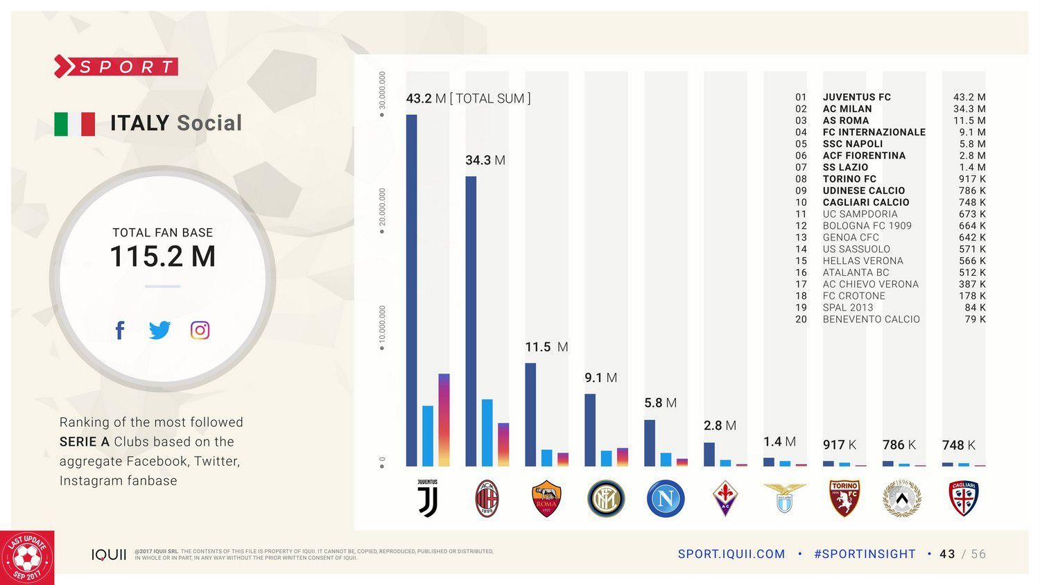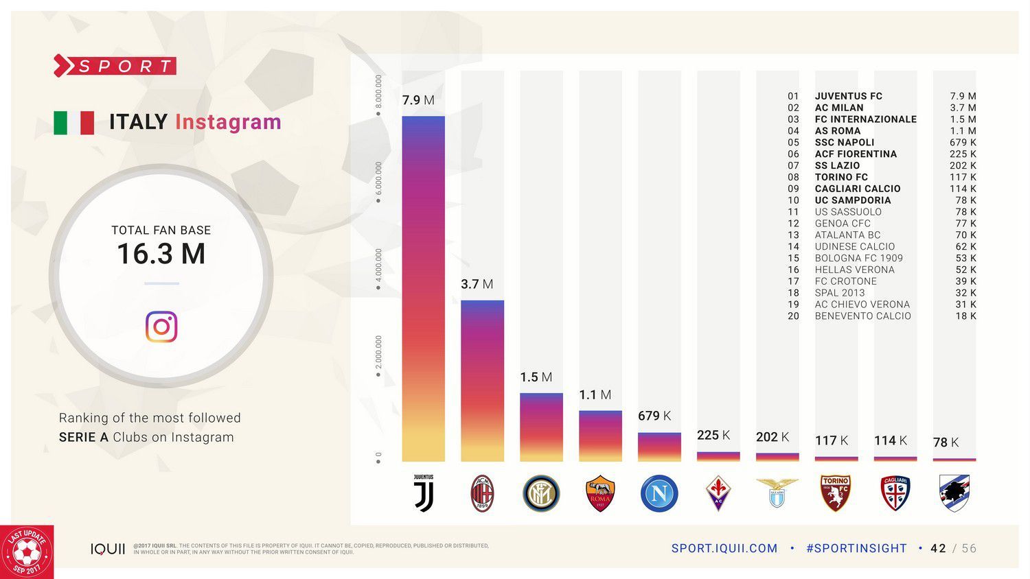 In the contemporary football scenario, social networks are pivotal assets for clubs. We have already talked about the branding and image problem of Serie A and its club, and we highlighted that an important part of that was the lack of online presence on social networks. Few clubs seem to have a coherent and efficient social strategy that matches the aesthetic standards of our time: if you take a quick tour on the Instagram profile of various team it will be crystal clear about the taste and the scarce number of followers, that is ulòtimately the most important metric to measure the online presence of a club. The private company IQUII Sports has released a report about Serie A's and European clubs that count the number of followers on the three main social media channel: Facebook, Instagram, and Twitter.