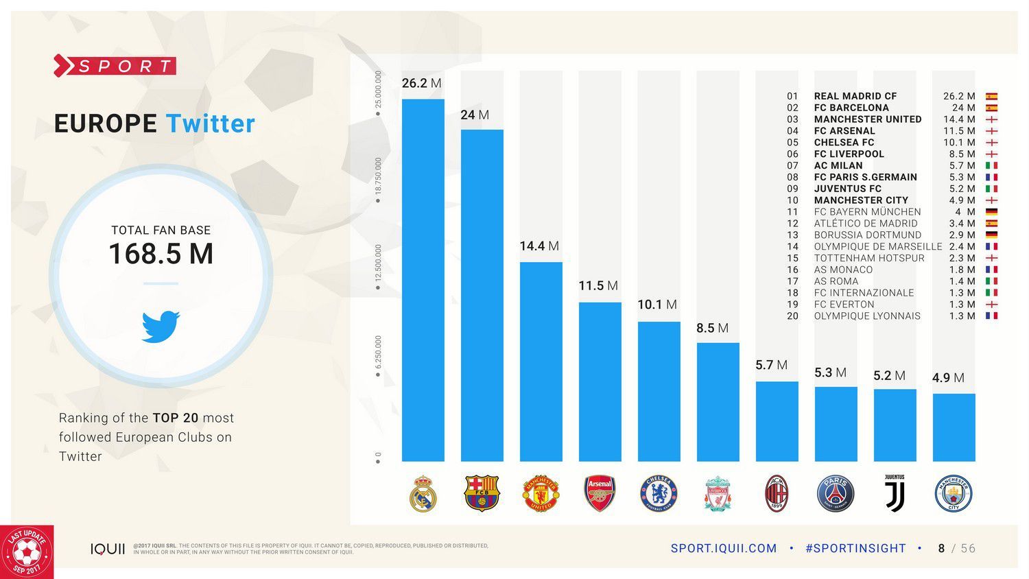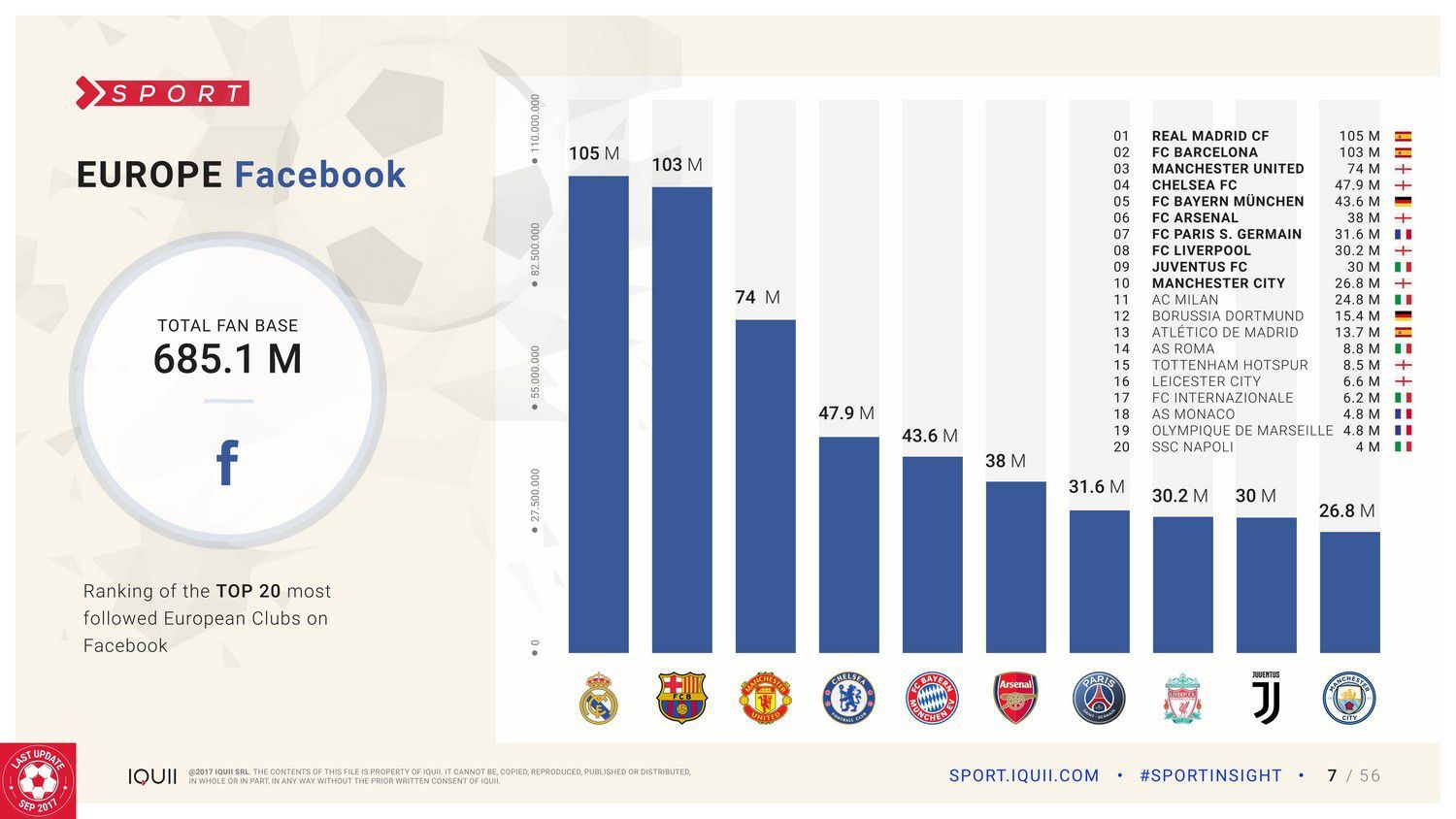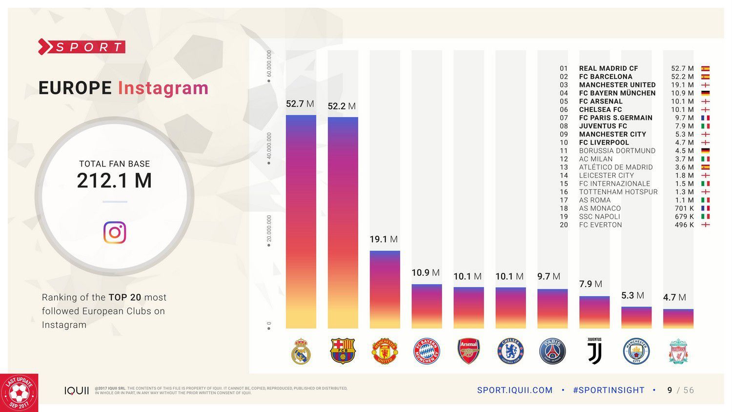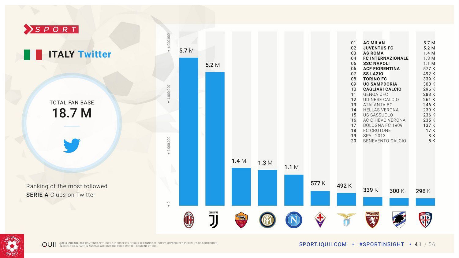 In the contemporary football scenario, social networks are pivotal assets for clubs. We have already talked about the branding and image problem of Serie A and its club, and we highlighted that an important part of that was the lack of online presence on social networks. Few clubs seem to have a coherent and efficient social strategy that matches the aesthetic standards of our time: if you take a quick tour on the Instagram profile of various team it will be crystal clear about the taste and the scarce number of followers, that is ulòtimately the most important metric to measure the online presence of a club. The private company IQUII Sports has released a report about Serie A's and European clubs that count the number of followers on the three main social media channel: Facebook, Instagram, and Twitter.