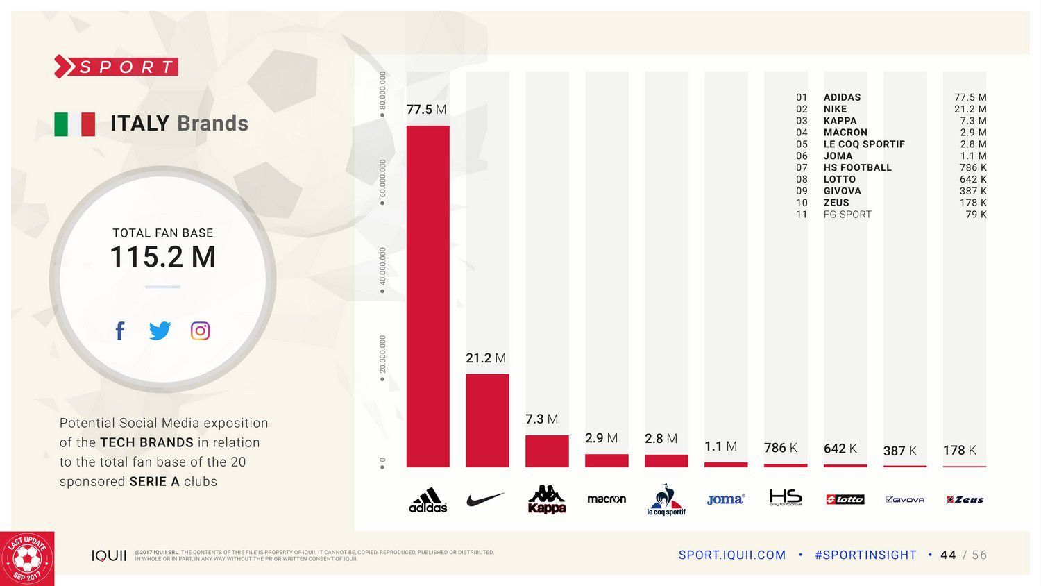 Juventus and Milan guide the Serie A ranking with 43,2 and 34,3 million of followers (it's the sum of the three social networks' audiences). After a big gap of nearly 20 million, Roma is on the third place with 11,5, followed by Inter and Napoli that are still under 10 million. As in the real ranking of Serie A, the last two teams are Spal and Benevento that are both under the 100K followers, a ridiculous result for a professional Serie A's team. From a quality point of view, the majority of the accounts are almost amatorial, for instance, Crotone's Instagram is not even "official". In addition, just the top teams use English or other alphabets: a borderline case is the Napoli's official twitter, that should take reps of English classes. In the last slide, it is possible to look at the social exposure that the brands benefit from the club's social account: adidas is dominating the scene because of Juventus and Milan, from next season the brand will leave the Rossoneri and the whole system will be more balanced.