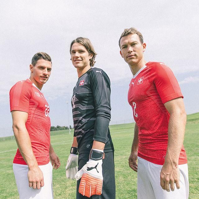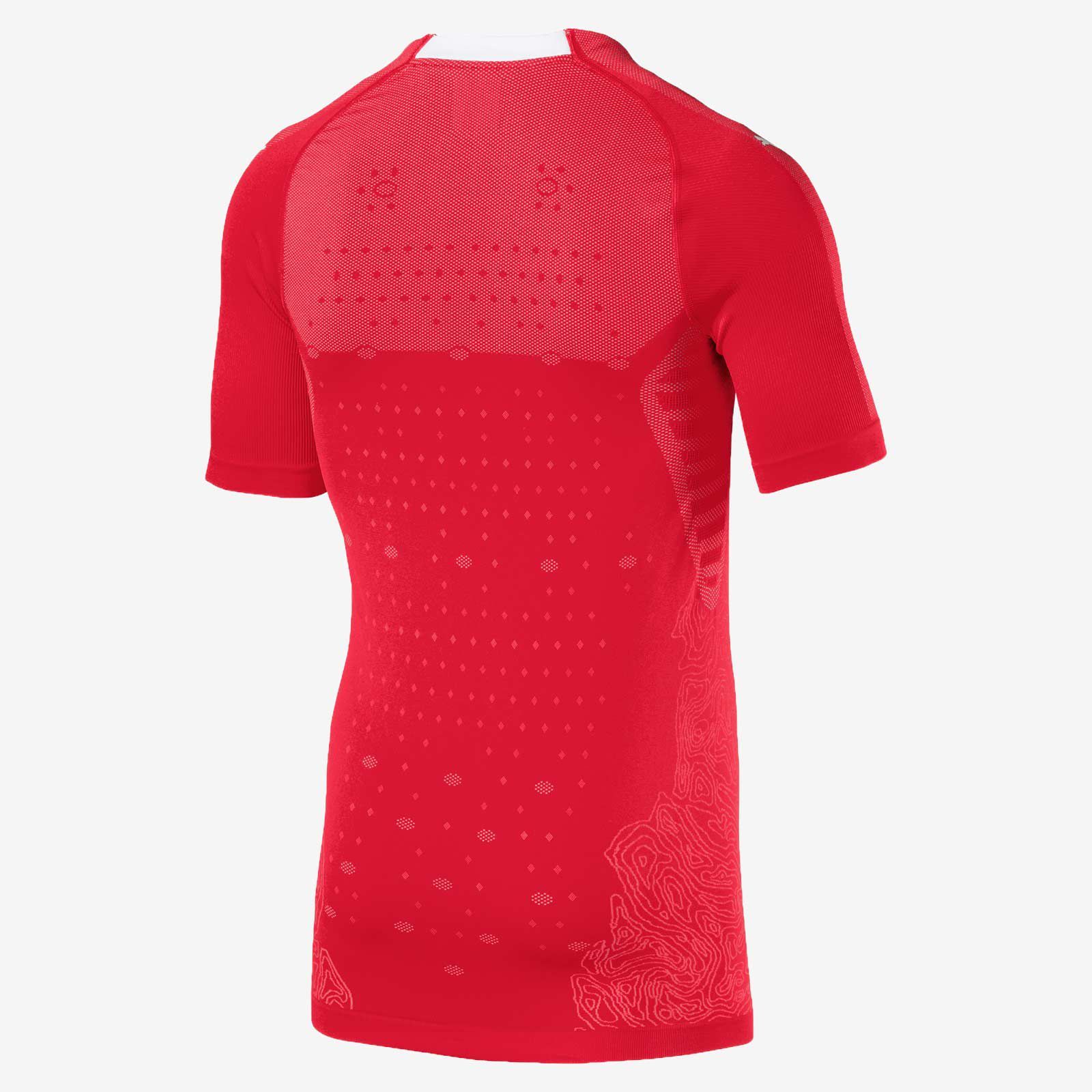 Modeled by Switzerland players Fabian Frei, Fabian Schär and Marvin Hitz for its launch the new “Schweizer-Nati” home jersey uses the customary red base with white accents of Swiss national team primary kits. A topographic map of the Matterhorn mountain appears on the front of the shirt. The Swiss cross, SFV crest and the PUMA Cat logo appear on the chest in white to contrast with the rest of the kit. Another Swiss cross can be found on the inside of the collar. The right part of the cross includes word “Switzerland” in all four of the country’s national languages.