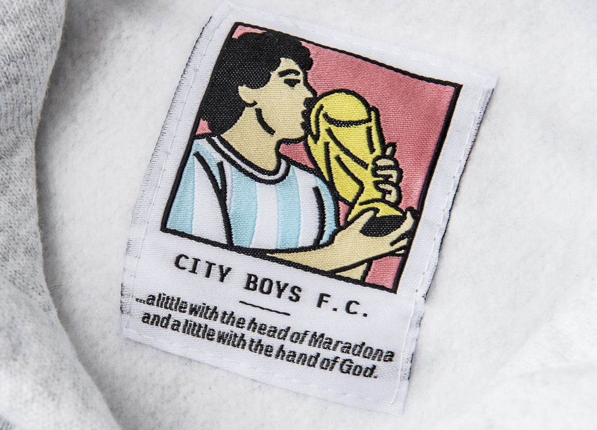 No, probably not. Also because that is the last creation of the guys at City Boys FC, a creative collective based in Japan, that use its creative inspiration to interpret in a modern way some aspects of vintage football. This time, it played on the cult of Maradona, a movement that starts in Naples (of course) reaching every corner of the world. Loving the “Diez” ofter looks like being part of a religious dimension, creating a connection that bonds all the devote followers of D10S. And this very religion is represented by City Boys FC’s “Maradonian Church Hoodie”, that other than the American college styled writing, can praise a wonderful label. Under Maradona’s pic kissing the World Cup, there’s a writing: “A little with the head of Maradona, a little with the Hand of God”. Must have.