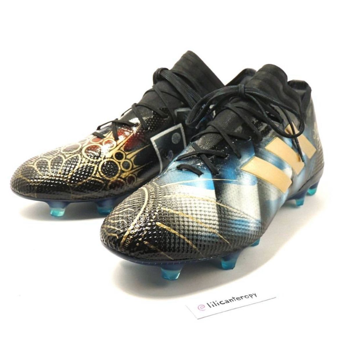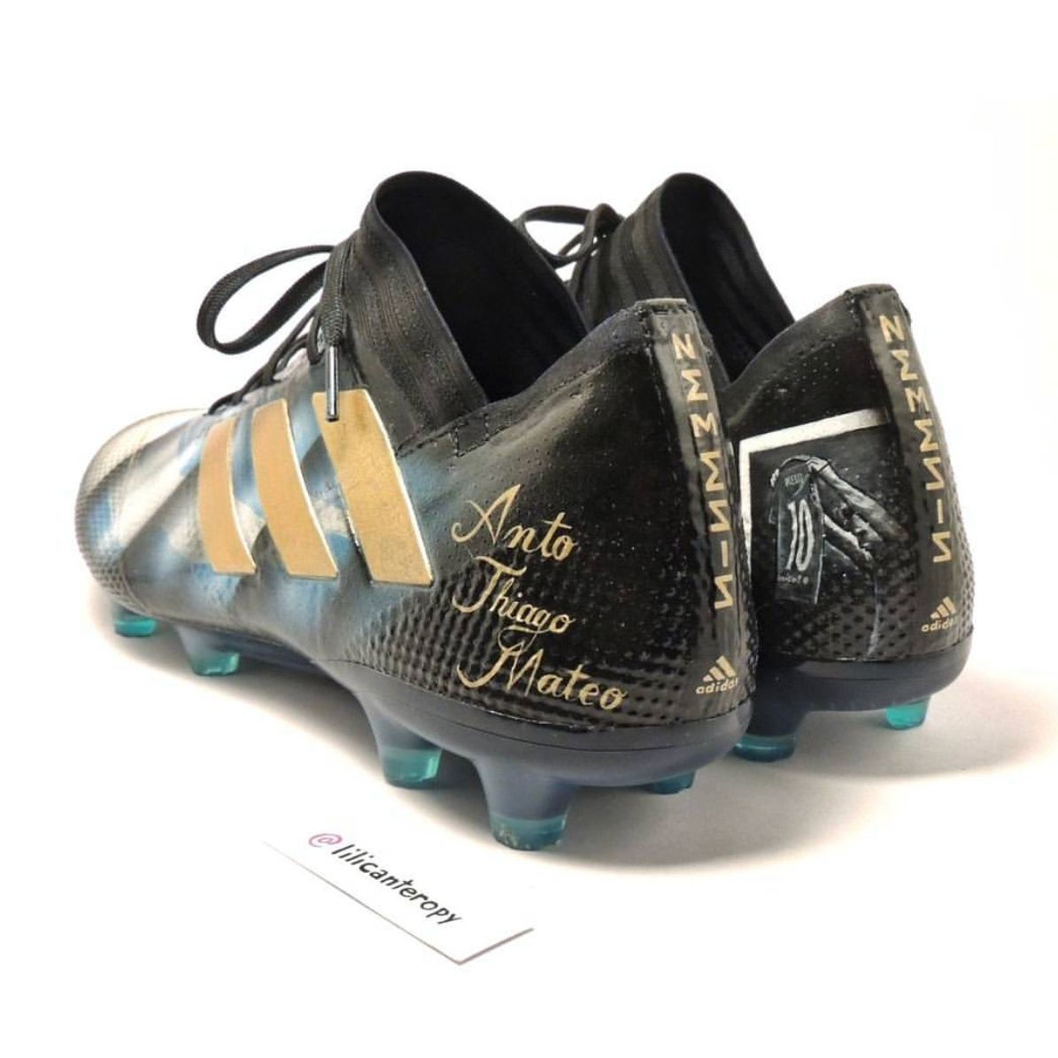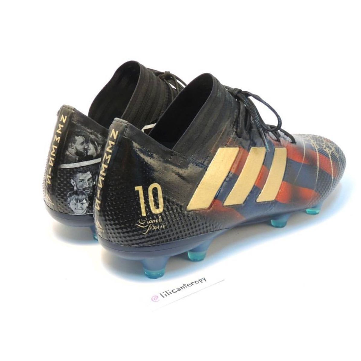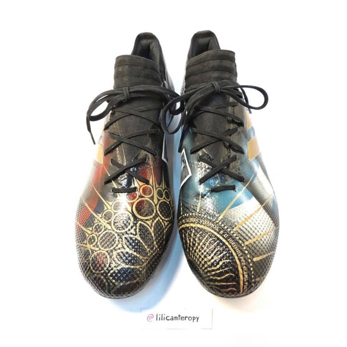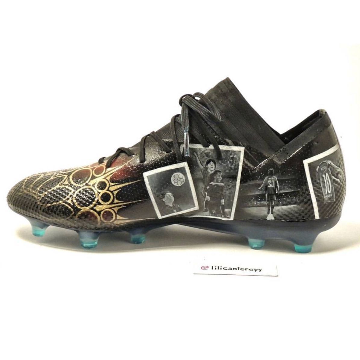 Leo Messi will certainly be used to receive every kind of present from his fans, even if this time he received one that we also can enjoy, even if from distance. Renowned Paraguayan designer Lili Cantero realized a pair of custom adidas Nemeziz for la Pulga, entirely decorated with handcrafted details of the Argentinian’s life and career.