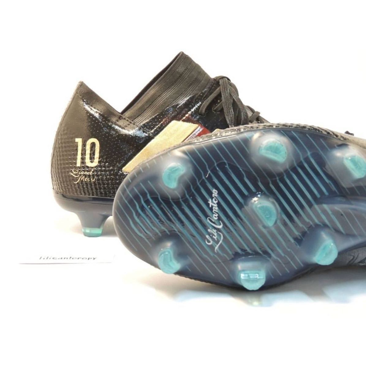 The shoes have both a black basis, with the right one embellished with Barcelona’s Blaugrana and the left one adorned with the albiceleste of the Argentinian national team. Other than Messi’s number 10 and the names of his wife and children - placed on the back side of the shoes - the two Nemeziz are decorated with pictures of important moments in Leo Messi’s life and career: his first years at Barça, his celebration with Ronaldinho, the historic one with him showing the jerseys after the winning goal in the Clasico at the Bernabeu. And pictures with his wife, his children and his mother Celia.