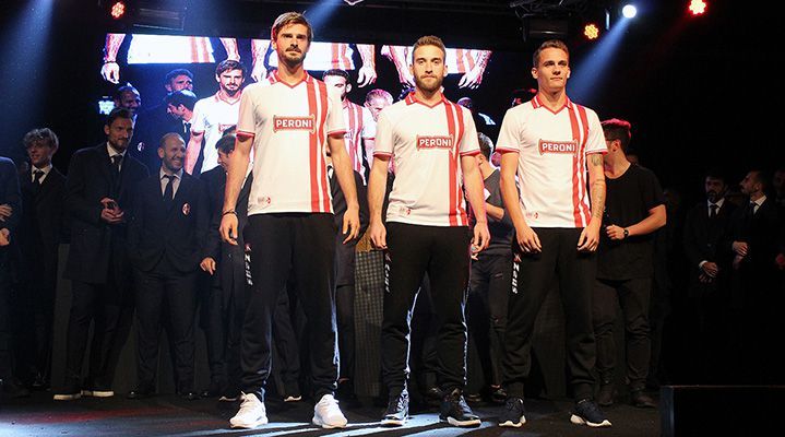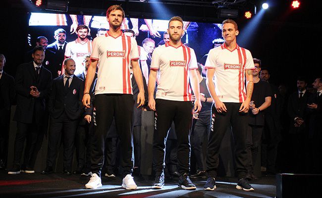 Italian Serie B promotion hopefuls Football Club Bari 1908 have released a self-branded 110th Anniversary kit in collaboration with the famous Italian beer brand Peroni. The new shirt uses the club’s home white with red accents. It is based on the primary jersey worn by then AS Bari during the 1976-1977 season. Like the seventies era kit, the FC Bari 1908 anniversary shirt has two red vertical stripes on its left front. The retro look is completed with a red and white polo collar and v-neck.