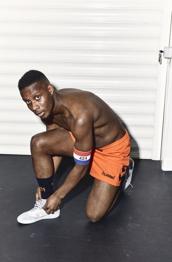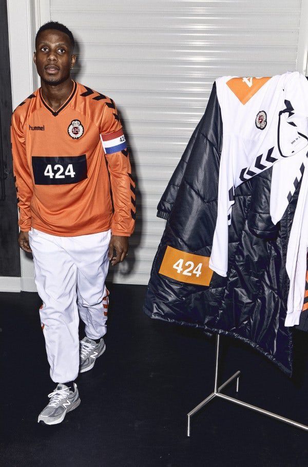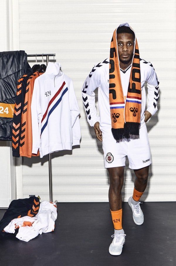 In the lookbook shot by STOY you can appreciate Hummel’s products - football shirts and shorts, sweatshirts and scarves - branded by 424, with some colors that have to remind you of the Dutch national football team. All the items of the collection are co-branded and feature both Hummel and 424 logos. There also is a captain armband, an orange scarf with the “Four Two Four” writing and an oversized coat with 424 orange branding