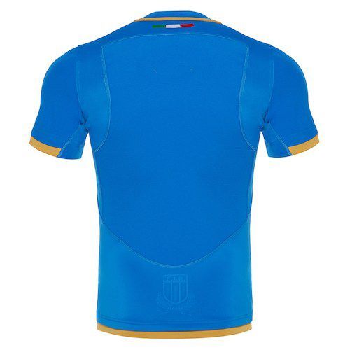 One of the great news of the Six Nations' edition is the italian shirt, for the first time designed by the Bologna-based company Macron. The new shirt marks a return to the classic combination of blue shirt, with a shade of dark compared to the experiments of "television" colors made by adidas. The most striking detail is the golden border of the shirt and the same Macron logo. The uniform is completed by white shorts and blue socks.