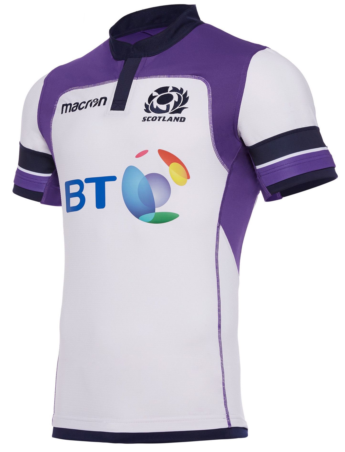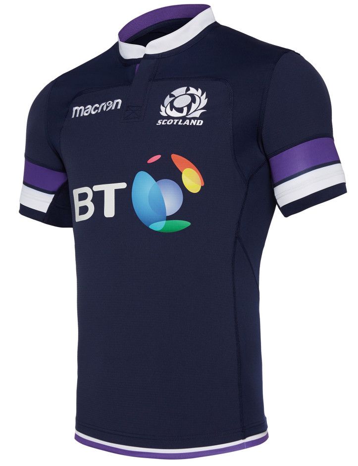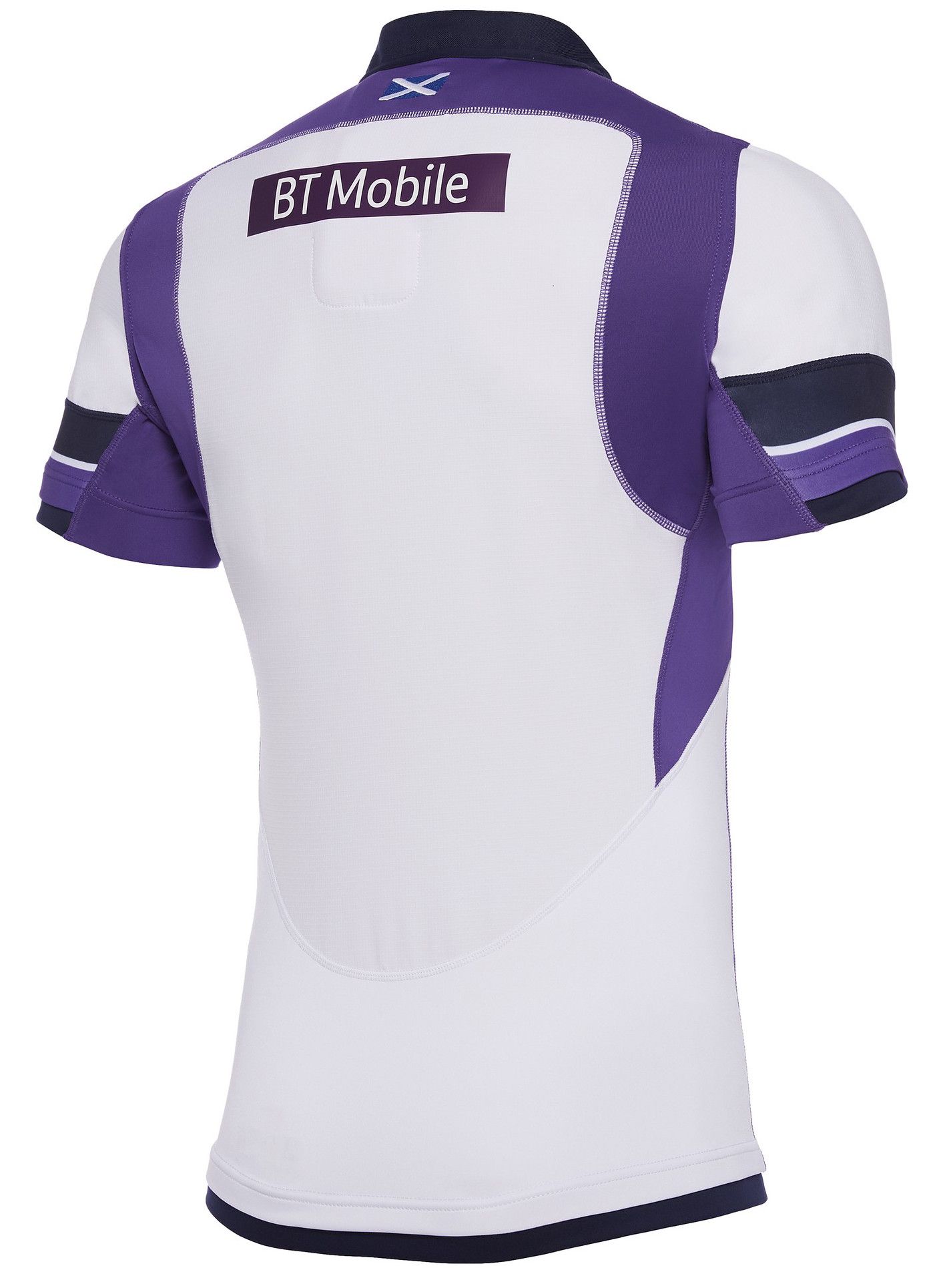 The scottish jersey designed by Macron is the most traditional among the 6 of the tournament: the collar is white, like the old heavy cotton uniforms that the introduction of technical fabrics and new design had abolished. The colorway presents the traditional navy blue and has on the back, in the lower part, the Cardo present on the historical tunic of the Grand Slam 1990 in the Six Nations. Under the collar there is space for the Scottish flag with the Saint Andrew's cross. Inside the light blue neck with Scotland in white. Tone-on-tone blocks are inserted on the sides of the shirt. The uniform is completed by white shorts with blue stripes on the sides and blue socks with white turn-ups. The away jersey has the same design but in inverted colors.