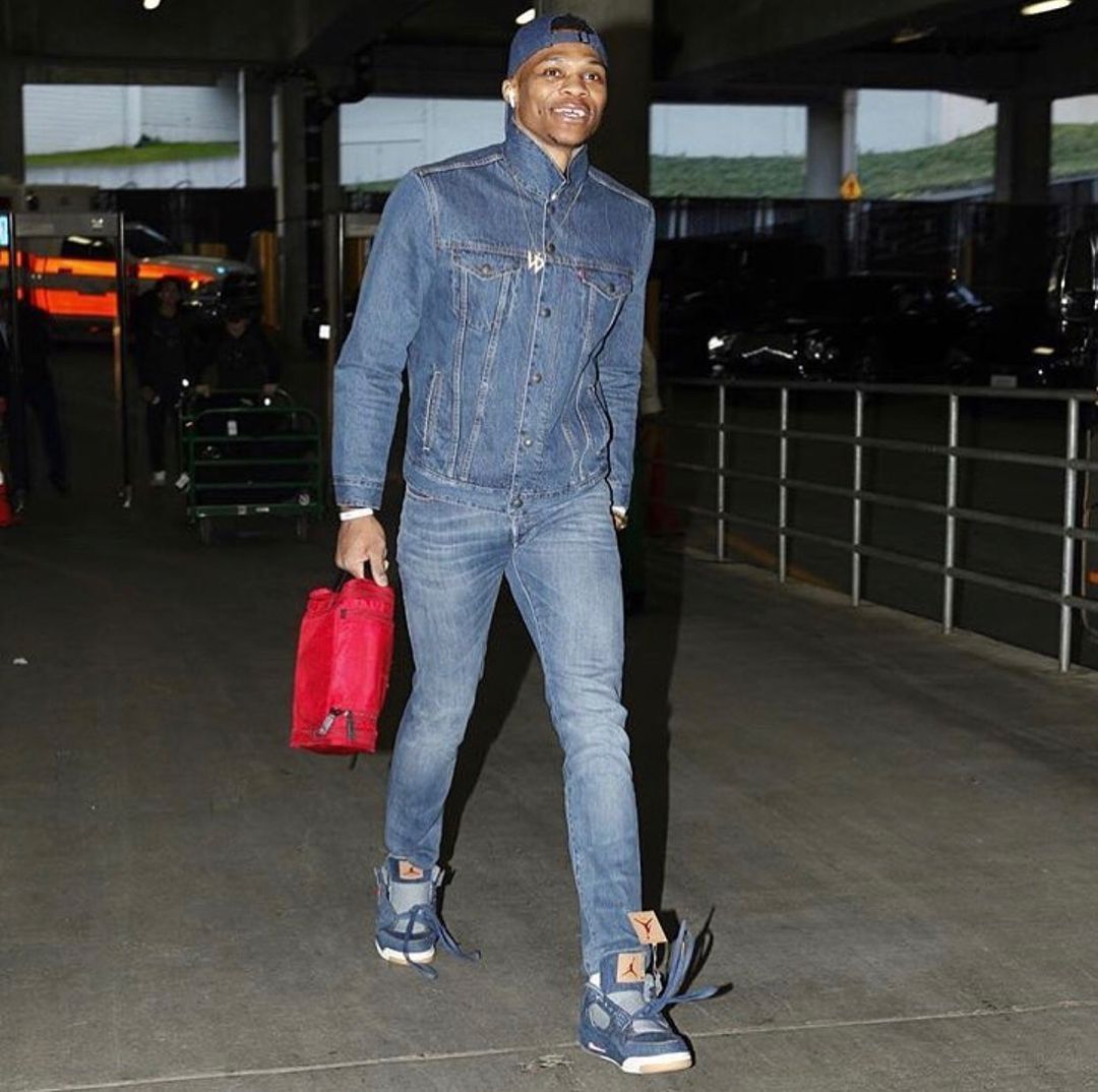 The Beard is usually one of the best-dressed athletes, but this time James Harden actually makes an airball. Not for the camouflage outfit, but for the tracksuit. We don’t even want to know the brand, and then… A black hat with blue shoes? Quoting Sheed: “R U SERIOUS?”. Then, there’s Russel Westbrook, that this time only saves himself by wearing a pair of Levi’s x Air Jordan 4 Denim.