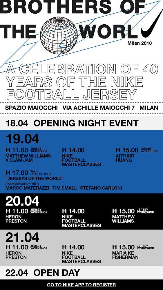 The exhibition is part of the "Brothers of the World" campaign - which we are telling you exclusively about nss magazine - and will serve as a side-dish for the workshops on jersey customization (from 19th to 21st April) at Spazio Maiocchi featuring Matthew Williams and Heron Preston, and a talk with Marco Materazzi, Tim Small and Stefano Carloni. DFi below you will find the complete program of events organized by Nike during the Design Week: to participate in the workshops you need to register on Nike.com.