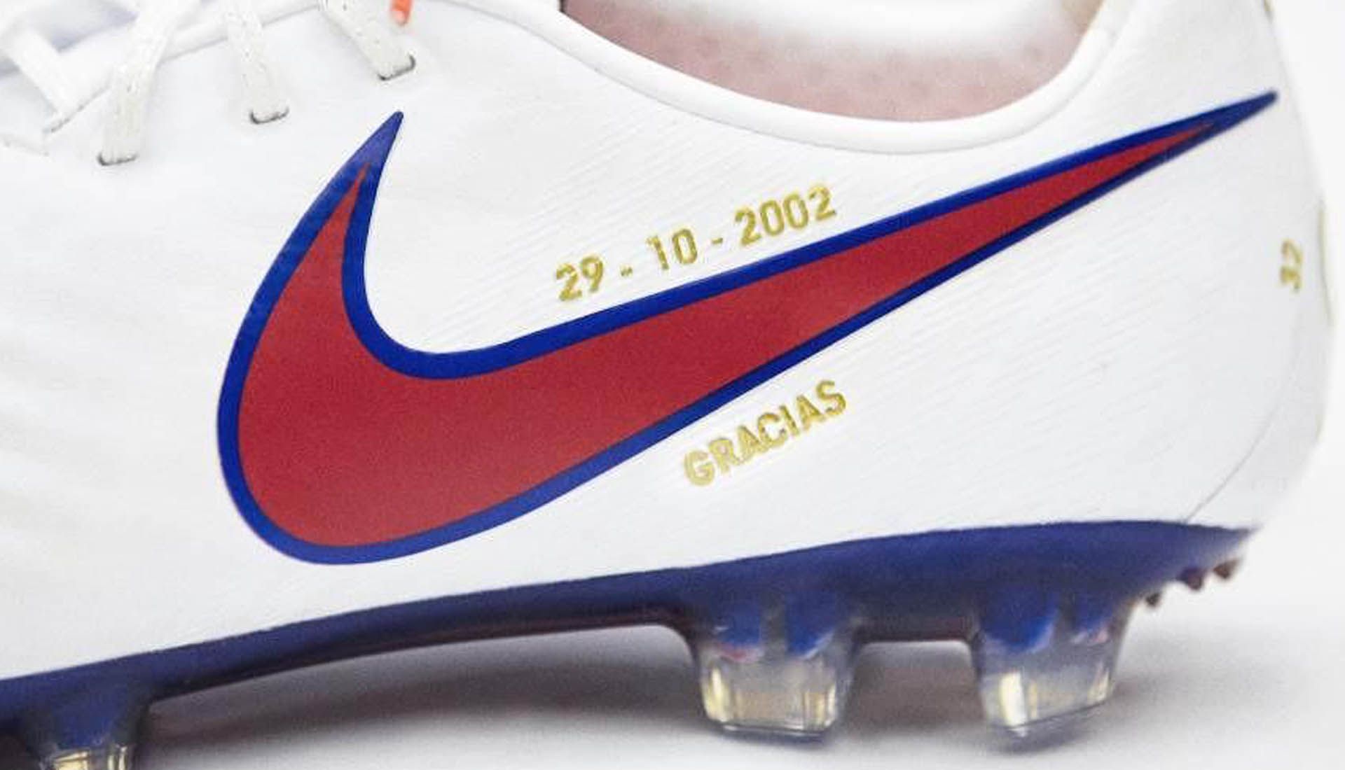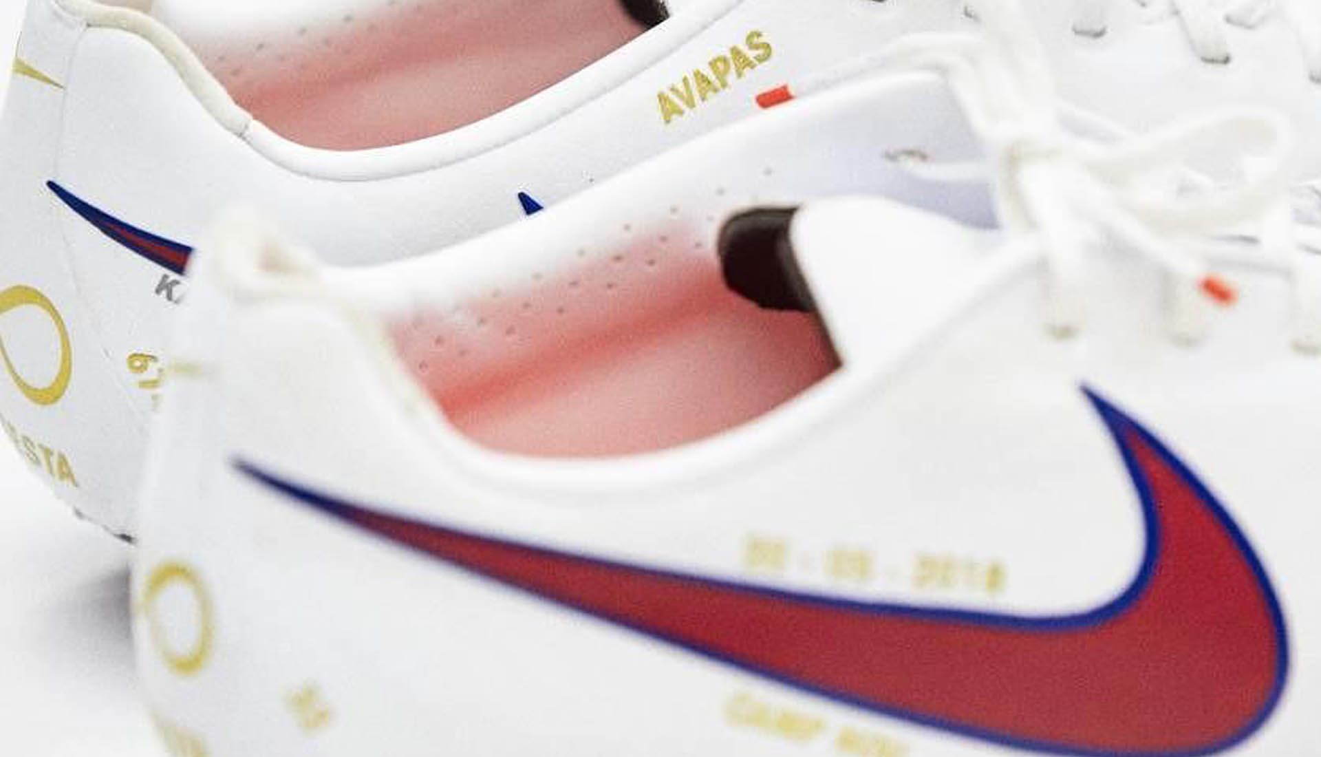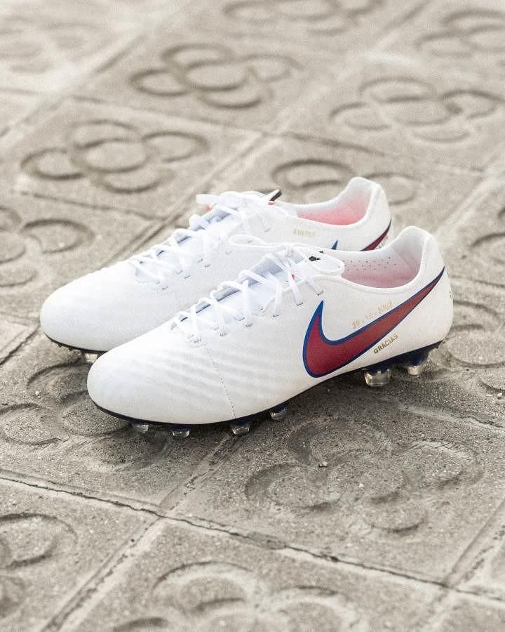 This particular Nike Magista is white, with lateral Swooshes and soleplate that takes the colors of Barcelona’s badge. Among the golden details we can find: the infinity symbol (the same used on the shirt), the date of the debut and the last game with the Blaugrana shirt - 29/10/02 and 20/05/18 - the “Gracias” and “Camp Nou” writings, the “A. Iniesta” writing, the numbers 674 and 32 (respectively the games played and the trophies won) and finally the “El éxito es la suma de pequeños esfuerzos repetidos día tras día” writing, that means “Success is the sum of small efforts repeated day after day”.