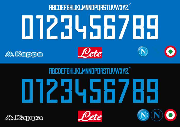 That of analyzing the football fonts is one of our obsessions, and so we could not exempt ourselves from the focus on what will be used by SSC Napoli for the 2018/2019 season. The club of President De Laurentiis, who as you already know is wearing questionable Kappa's kits which are just discussed for their exuberance, has chosen to adopt a rather edgy font, completely different from the sweeter and more rounded one that had been applied during the past seasons.