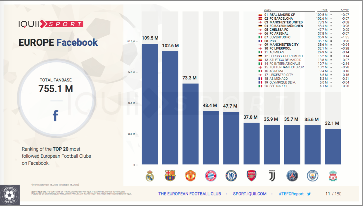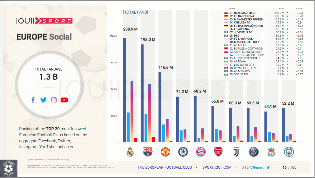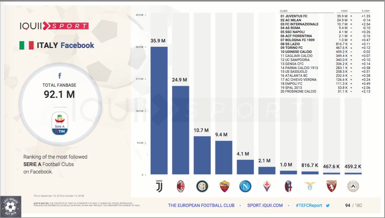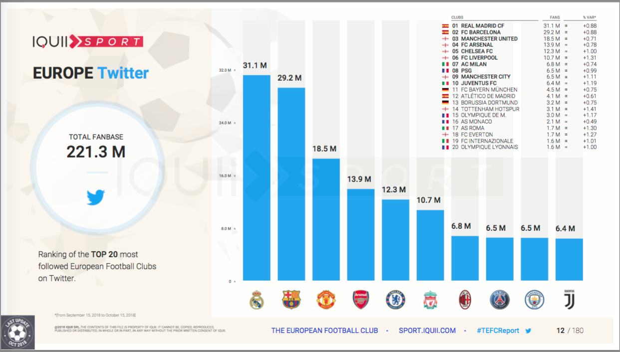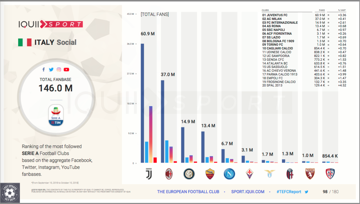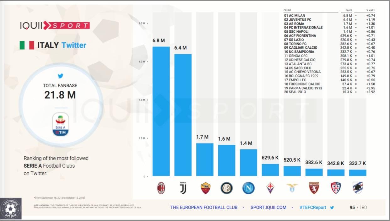The base on which IQUII began its studies is very wide: 6 Nations, 237 clubs, 39 brands and 1.3 billion fans. But entering more specifically this analysis, we focus initially on the category that concerns our Serie A: it is not surprising at all that Juventus is clearly the queen in the social world as regards the Italian scene (60 million followers overall between Facebook, Twitter, Instagram and YouTube, against AC Milan's 37 and Inter Milan's 14), even if it is not yet on top in the special Twitter ranking, where it is slightly delayed against AC Milan (6.8 against 6.4 million) . In third place, AS Roma, which is the best growth rate among top clubs thanks to the incredible work done in the last months and that promises a lot.
