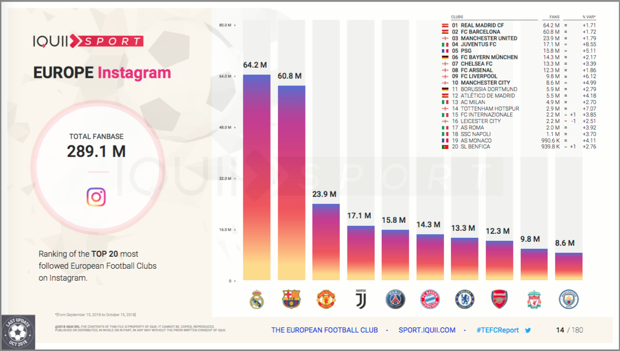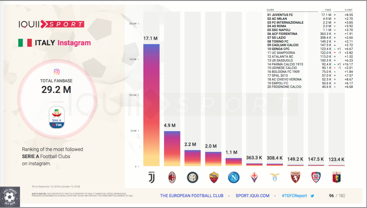 Who is the Italian team with the biggest number of followers on Instagram? And which one that has more engagement on Facebook? And also, which team has grown the most on social media platforms? And how are the status of the Italian Serie B clubs? To answer to these questions and many others, the annual IQUII Sport report has just come out, a valuable tool that will help you understand how things are going in the virtual world, never as close as today to the real football world. That of IQUII Sport is the 11th analysis and is a very useful guide if you want to know, between charts and stats, the trend of clubs all over Europe, but also of individual players. Shortly, 180 pages that we advise you to read, also because, downloading them is absolutely free.