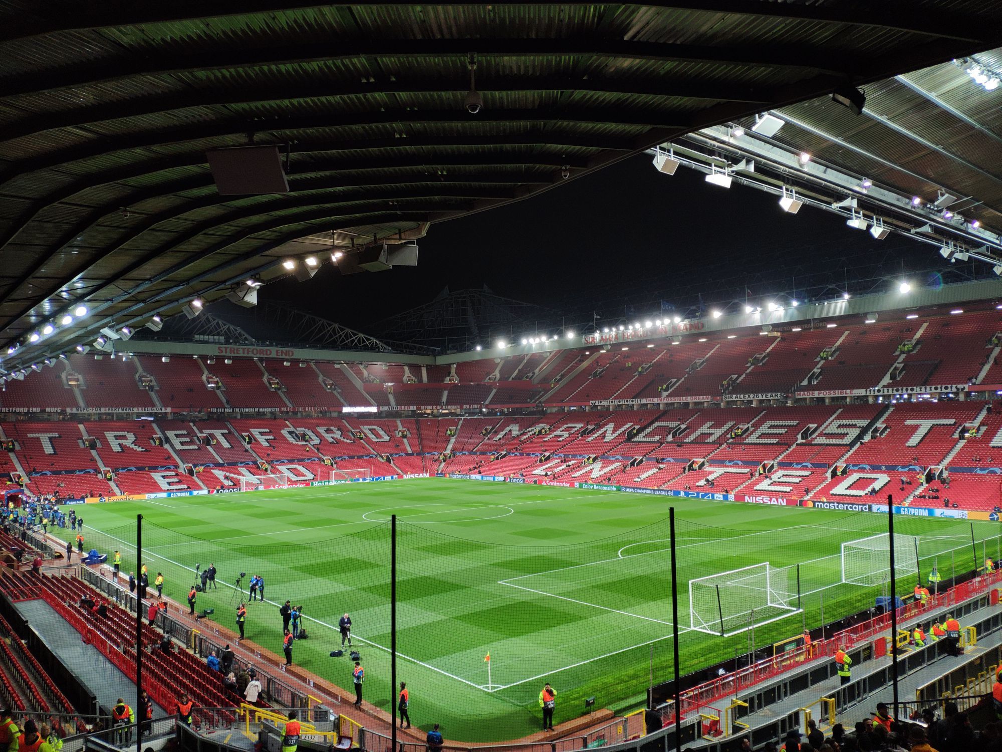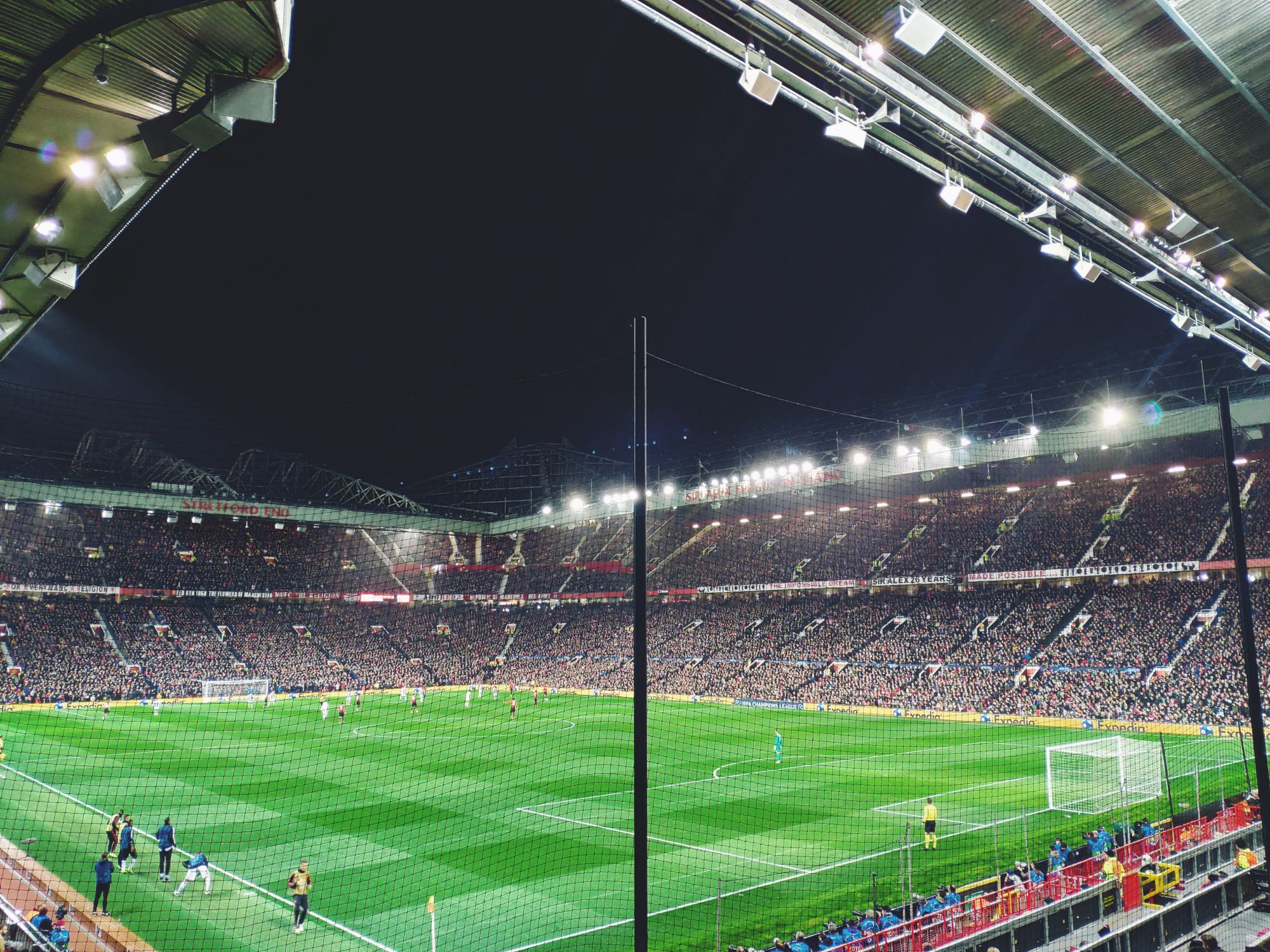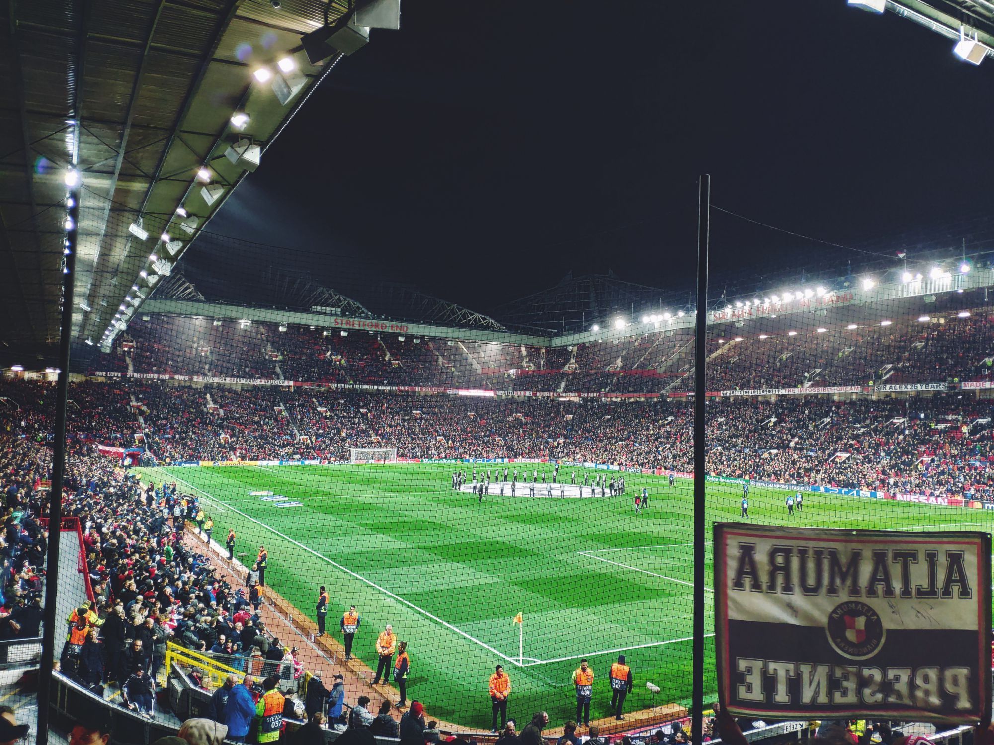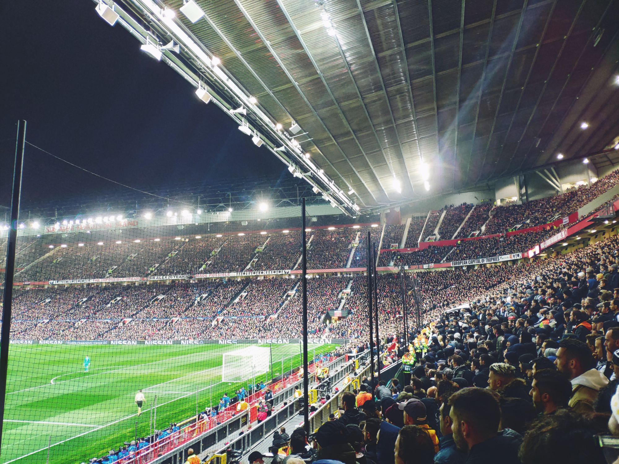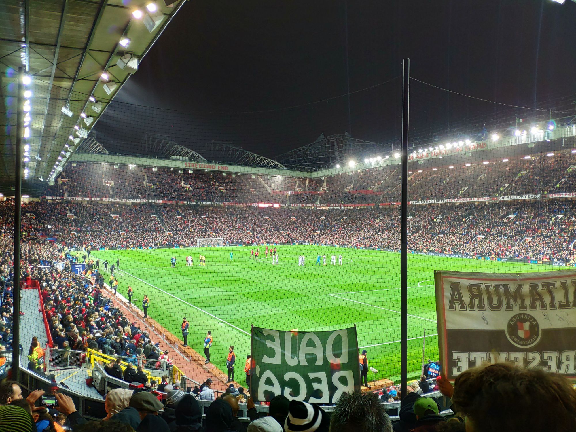 The wait rises and I'm looking forward to occupying my seat between 75,000. I pass the controls and I run, literally, up the stairs. Finally inside. One of the most beautiful stadiums in the world, on a Champions League night. I sit, I catch my breath. To my left the Sir Bobby Charlton stand, facing the Stretford End and to my right the Sir Alex Ferguson stand. There's still no one and it's all red, the stands and the bricks all over the stadium. The United plays here from 1910, with a small break from '41 to '49, due to the bombing suffered during the Second World War. At that time the Reds were hosted by the City's cousins at old Maine Road. The wait is almost over. As a child, when you start to get passionate about the game, you dream nights dream like this, in stadiums like this and matches like this. The fans begin to populate the stands, I eat the usual hot-dog and then "Glory Glory Man United, as the Reds go marching on on!". The Champions League jingle, like every single time, pushes me to a step from the tears and the goose bumps that will last until the quarter of an hour of play, starts here.