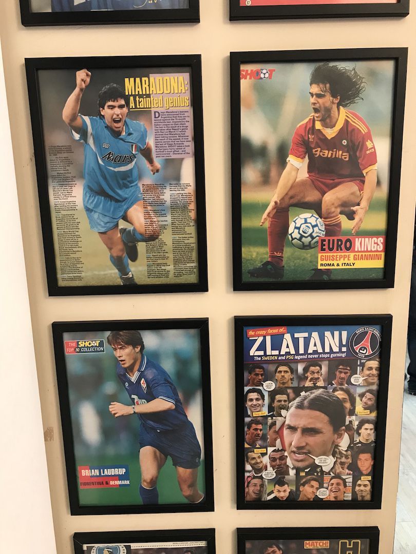Sometimes I take some breaks from my conversation with Paolo and I also start rummaging through the shelves, zapping between one category to another. But what amuses me most is to observe the reactions of the people close to me, who sometimes stop even for ten minutes to contemplate a shirt: again with Paolo we talk about the sense of fashion in the vintage collections, the importance of aesthetics in the world of football (in my mind is this old article written by The Guardian) and above all the nostalgia effect that is produced by the shirts that are on sale: 'It's all an emotional issue - he explains - due to the fact that observing, and often even touching a shirt can evoke old emotions and old memories. You can think of the pitch where you played when you were little or the place where you saw the game where you saw your favorite player score, whose shirt at that moment is in your hands. We always say that you have to pay attention to customers' faces when they are not at the cash desk, but when they look at a t-shirt closely. Why should they buy an anonymous shirt from a Nike store when they can choose a jersey that can help them dream or remember something? Walking around the store I understand the philosophy of Classic Football Shirts, and part of their incredible success, because it is really the place where you can find the shirt you've always looked for, but also the one you would never expect to catch. In addition to the jerseys there is much more that surrounds you: a series of bucket hats from Lazio, posters of Juventus, sparse copies of magazines like Mundial and Glory, beautiful Jimmy drawings on the walls, the long Umbro jackets that were used by Man. United players when cold. What a beauty!