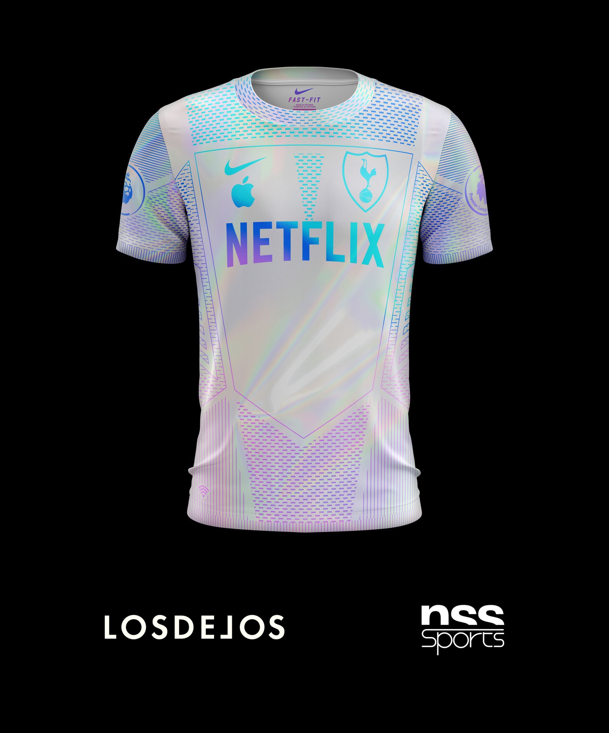 This design is "wired". Not wired literally, but it's designed with wifi connectivity. In the future, there won't be no "wires", but organic yarns that can conduct electricity, etc.. The connectivity allows for the coaching staff to get real-time stats for performance and also health. The connectivity also allows for certain information to be sent to media and fans, so they keep track of an individual player in a very intimate way. Because information is sensitive, only certain information is allowed. The connectivity also makes it easier for refereeing: whether it be offsides, knowing which player to give a card to, etc.. Because of the tech, the future would make for a collabo between Apple and Nike. (that's the reason of the wifi symbol at bottom right front hem). The iridescence is a reference to old school iMacs when they were translucent and also implies the "wired" aspect. And now that we see the likes of Amazon and Netflix getting into football documentaries, in the future they will be sponsoring more clubs and possibly even owning one.