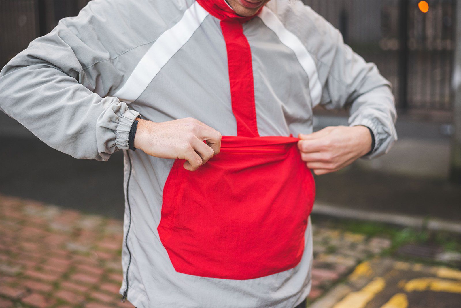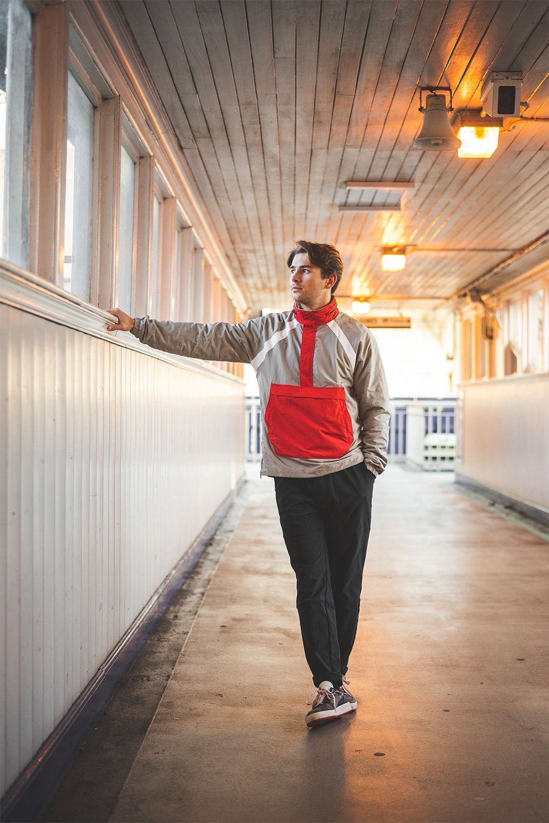 The anorak is inspired by the '80s football fans outfit and by the identity of Diadora, in fact the gray color is a tribute to the granite of Cereano di S. Marco, where the Italian brand was born and where the headquarters is still located, combined with white details on the shoulders and red ones, which colors the kangaroo zip pocket and a large side zip on the right side. The shoe is a jewel, nostalgia and a lot of football tradition are recovered, but also one of the main characteristics of the original model, that is the quality of the upper, entirely made of kangaroo leather, combined with an indoor football outsole. The logo in white is highlighted on both sides of the shoe and repeated in gold on the tongue, unite to the original "Made in Italy" tag line, recalled from the OG football boots. The one on the heel is white, with colored details and an Italian tricolor.