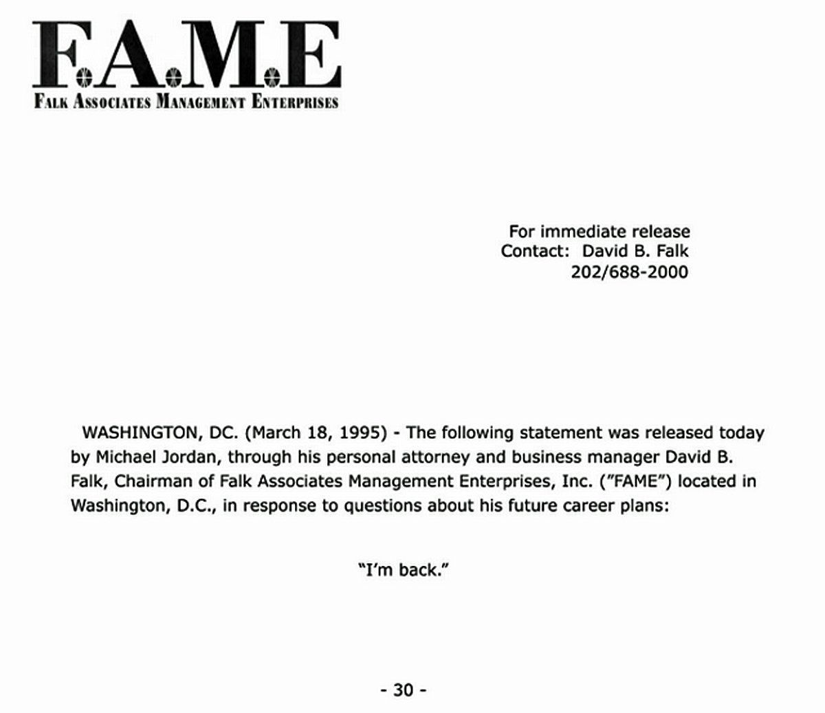 And that's what happened. On March 18th, 1995 at 11.40 am a statement was issued: "Michael Jordan informed the Bulls that he had interrupted his voluntary 17-month retreat, and will debut in Indianapolis against the Indiana Pacers on Sunday."