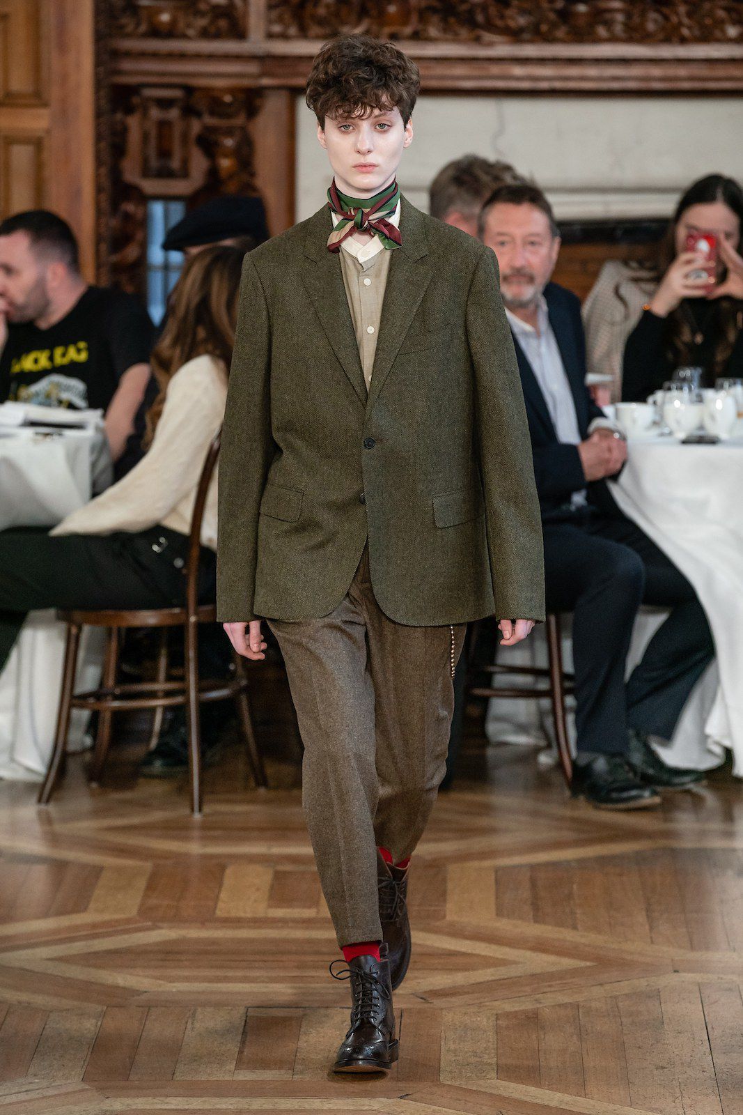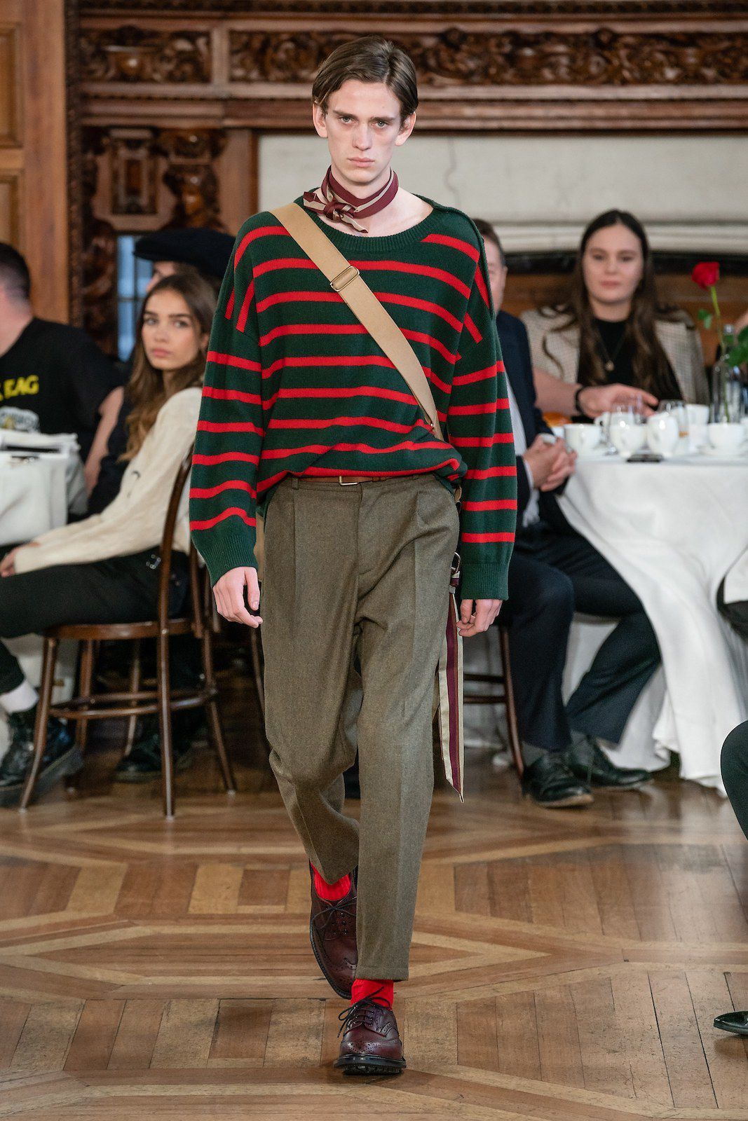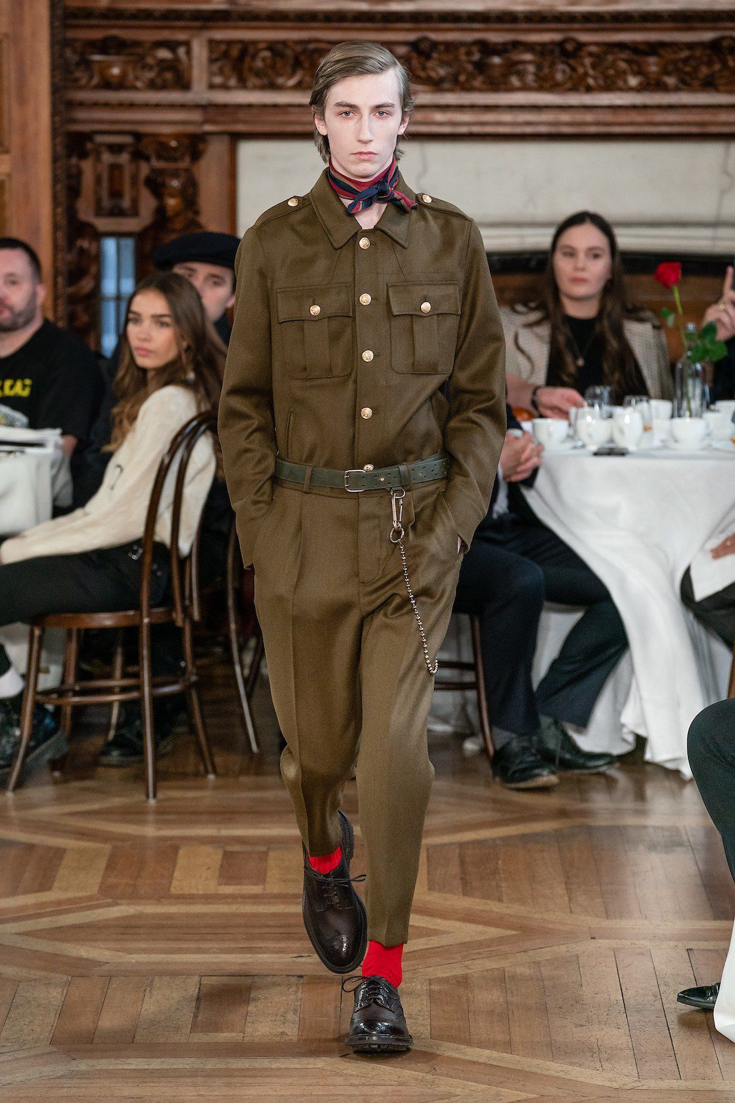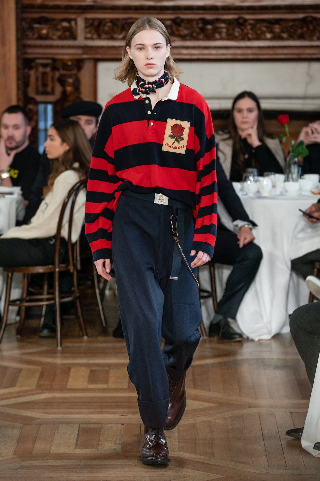 The men's collection designed by Daniel Karns showed up at 9 am, in what looked like a very British breakfast. The garments paid homage to the brand's history, among roses and vintage atmospheres, in an ancient, very scenic wooden building. Roses, Stripes, Rugby Polo, military forms, wide coats and prevalence of natural colors. The red socks, common to all the outfits, were the leitmotif of the proposals seen on the catwalk.