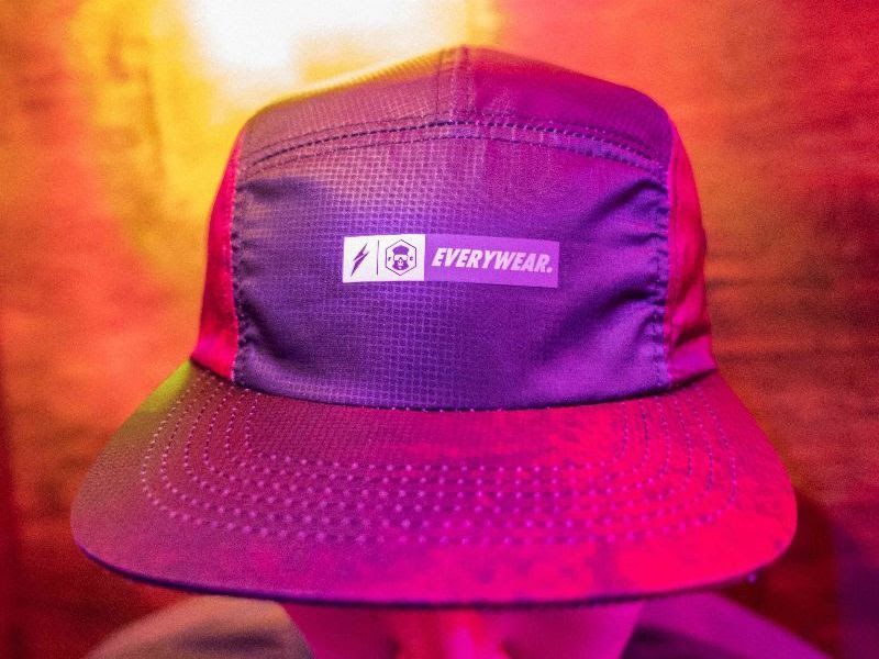 As we said, there's six different products, all dark: one k-way, a hooded and red-shaded sweatshirt, a t-shirt, a five-panel hat, a red and black ball and an armband.
